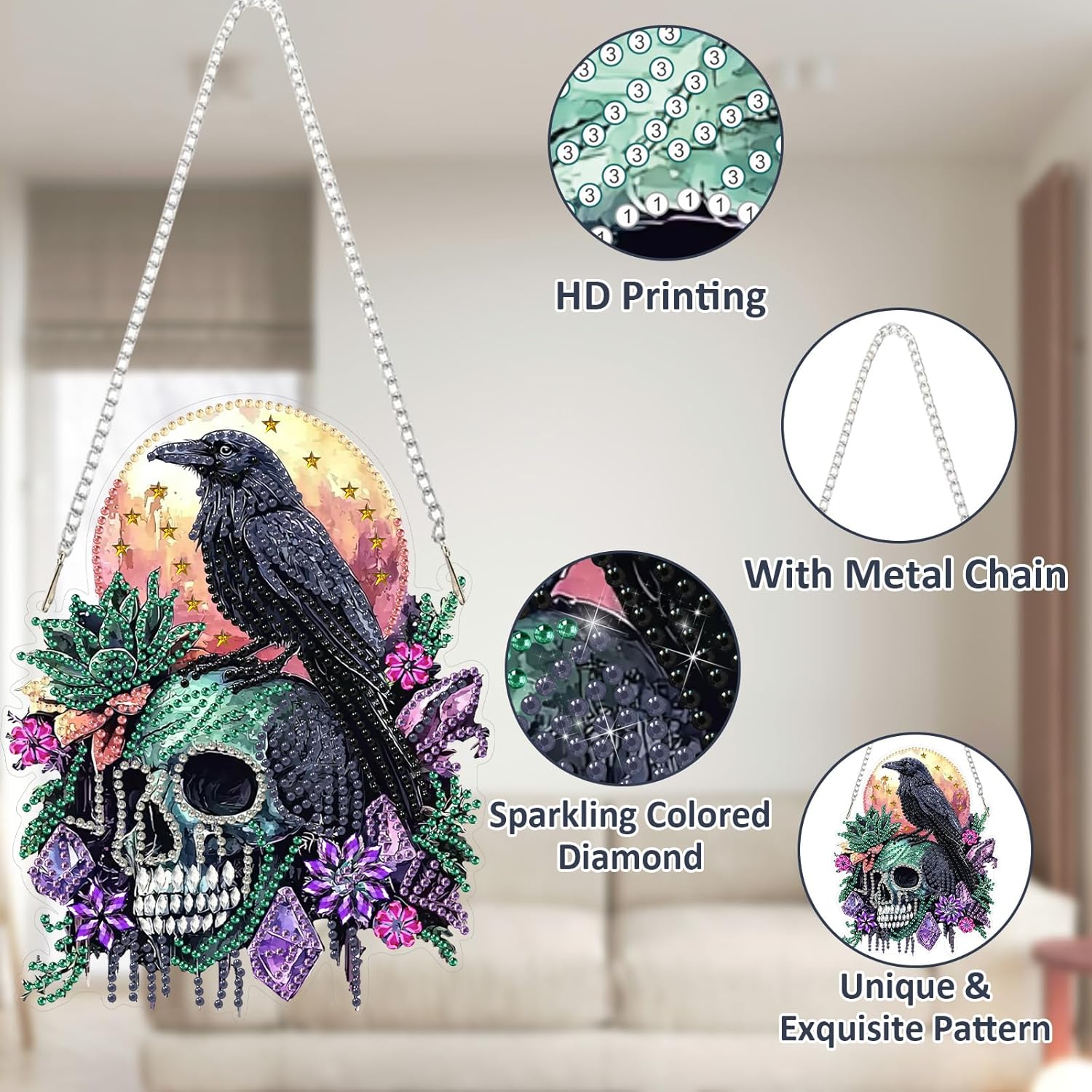 SENQAO Crow Diamond Art Hanging Kit for Adult, Special Shaped Rhinestone, Double Sided DIY Acrylic Diamond Art Painting Window Pendants Home Garden Wall Hanging Kits Hanging Ornament (Raven Skull)