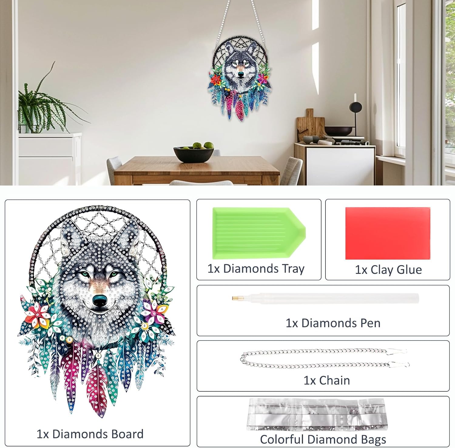 SENQAO Wolf Diamond Art Hanging Kit for Adult, Special Shaped Rhinestone, Double Sided DIY Acrylic Diamond Art Painting Window Pendants Home Garden Wall Hanging Kits Hanging Ornament (Dream Catcher)