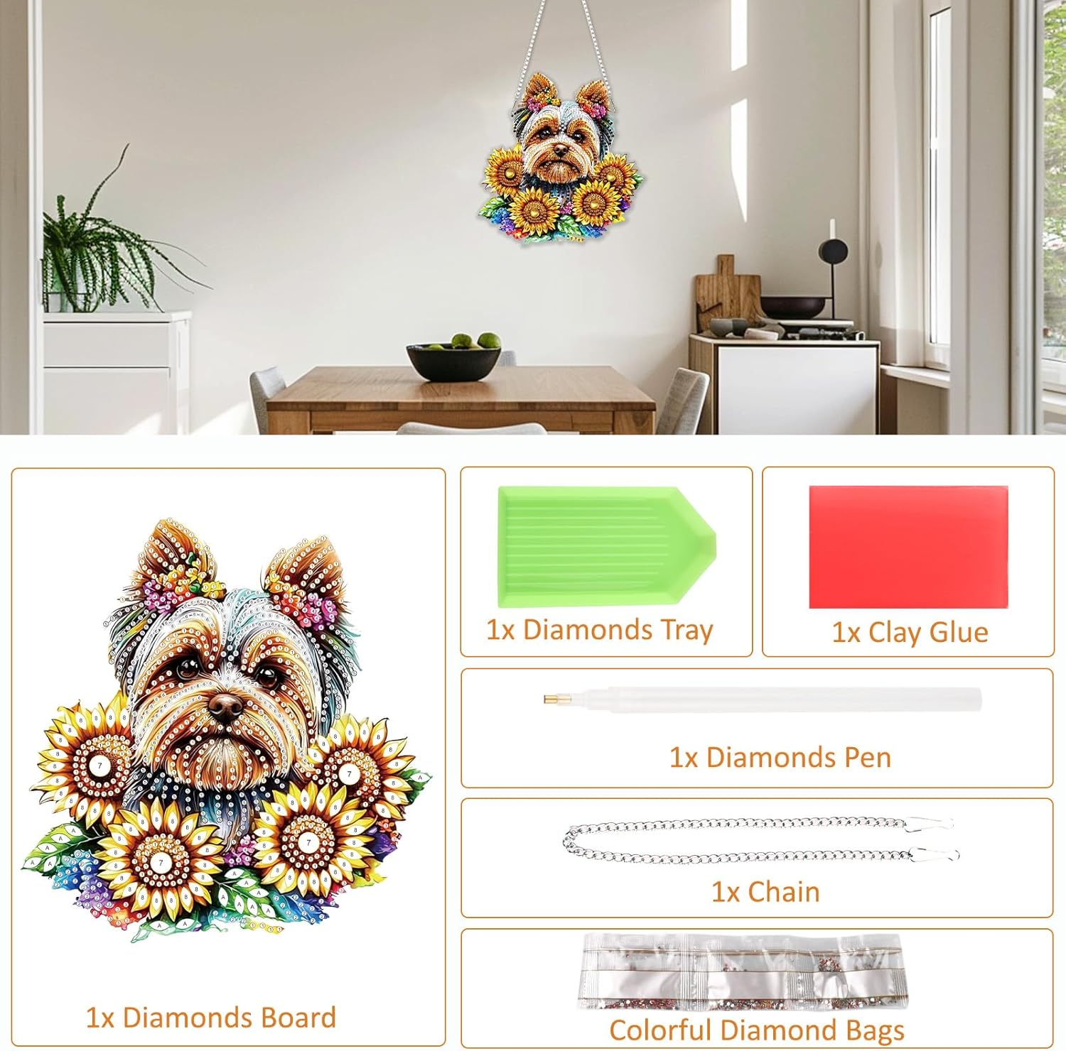 SENQAO Dog Diamond Art Hanging Kit for Adult, Special Shaped Rhinestone, Double Sided DIY Acrylic Diamond Art Painting Window Pendants Home Garden Wall Hanging Kits Hanging Ornament (Sunflower)