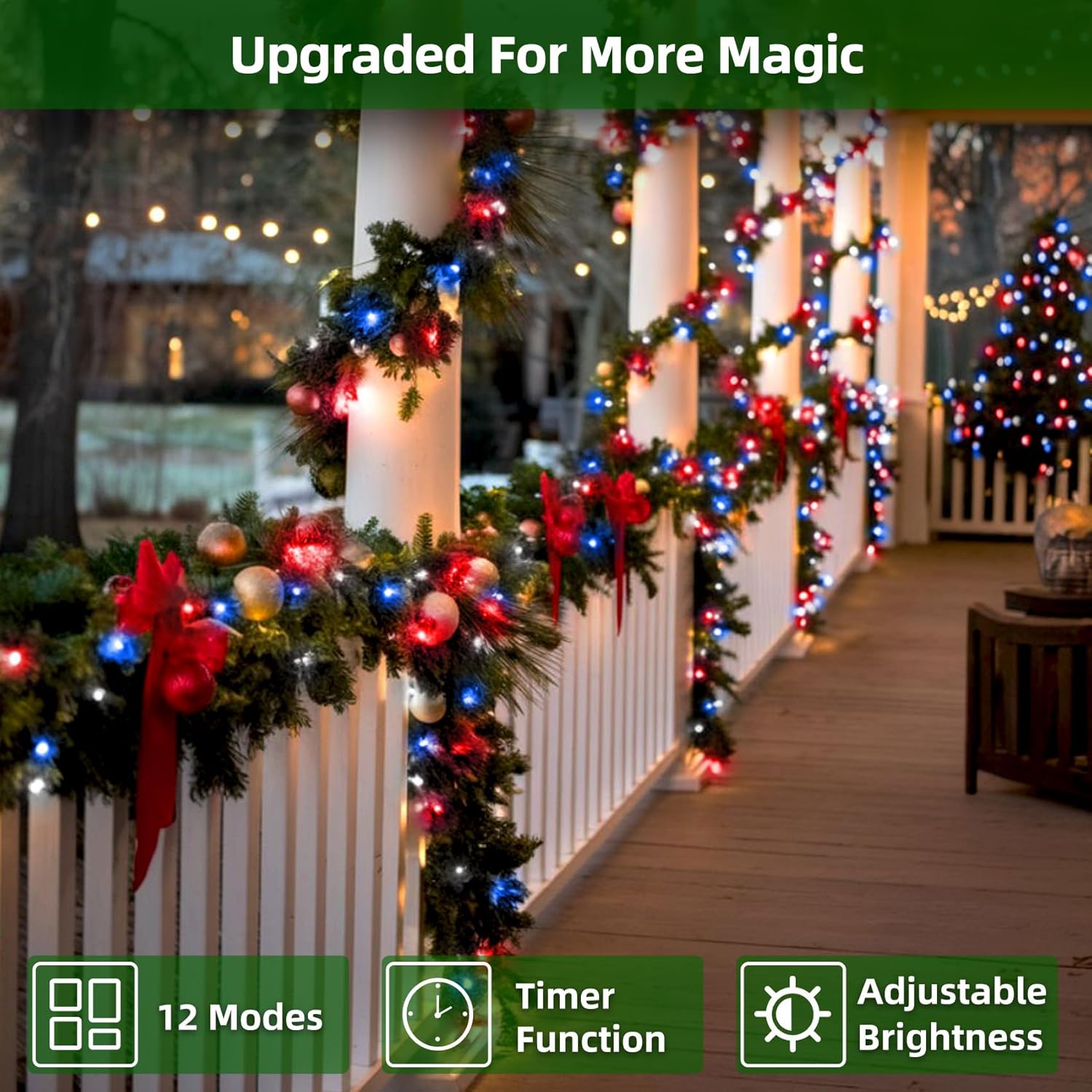 • Stress-Free Timer & Memory: No one wants to reset their Christmas tree lights every night. That’s why these outdoor string lights include a built-in timer (6 hours on, 18 hours off) so they turn on automatically at dusk and save energy while you sleep. The memory function recalls your last mode, so your favorite glow is ready every evening. Just set it once and enjoy your holiday decorations hassle-free, whether you like a gentle steady-on or sparkling party mode