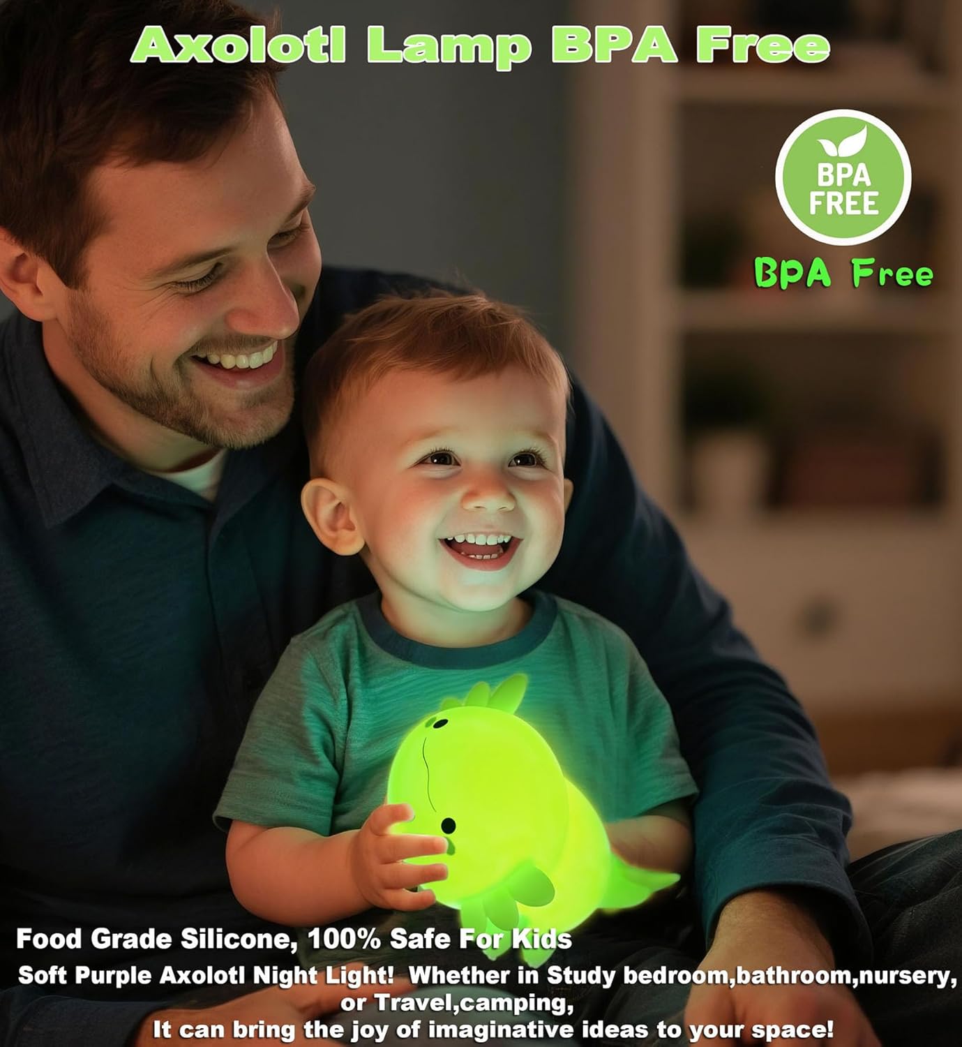 • Dimmable and BPA Free:Cute Green Axolotl Night Light for Kids,Choose food grade silicone material,BPA free Soft and pinchable,that won't heat up while in use.Safe material and design suitable for everyone including babies,axolotl lamp has two brightness modes.Turn on the switch and simply tap the Axolotl light to switch brightness