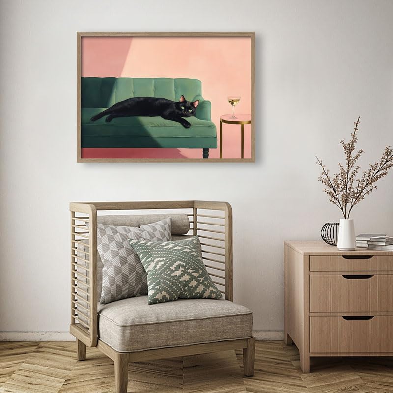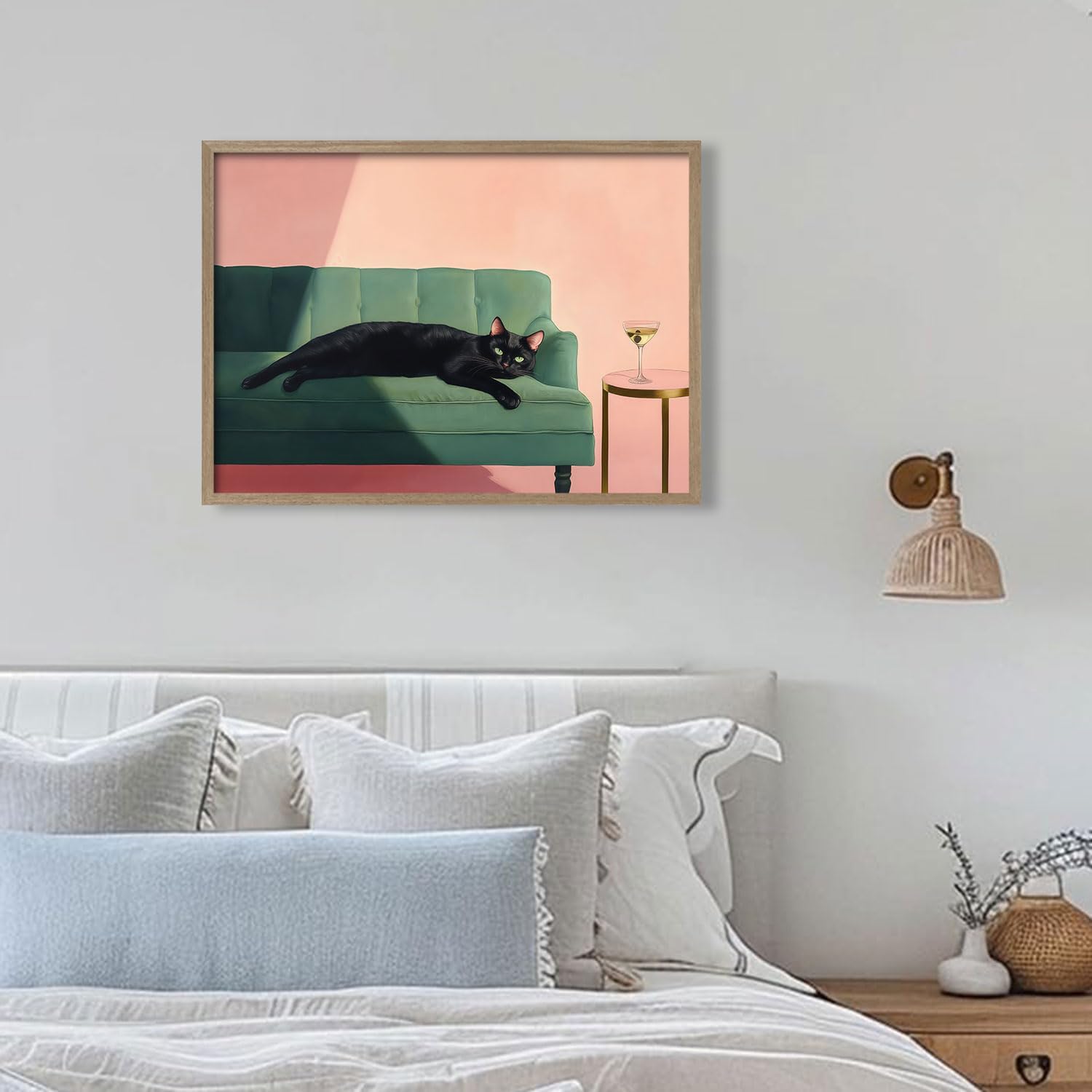 • Casual Style Black Cat Art: This painting shows a black cat lazily lying on a green sofa, with a warm pink background, giving any space a relaxing and pleasant atmosphere, perfect for modern homes.