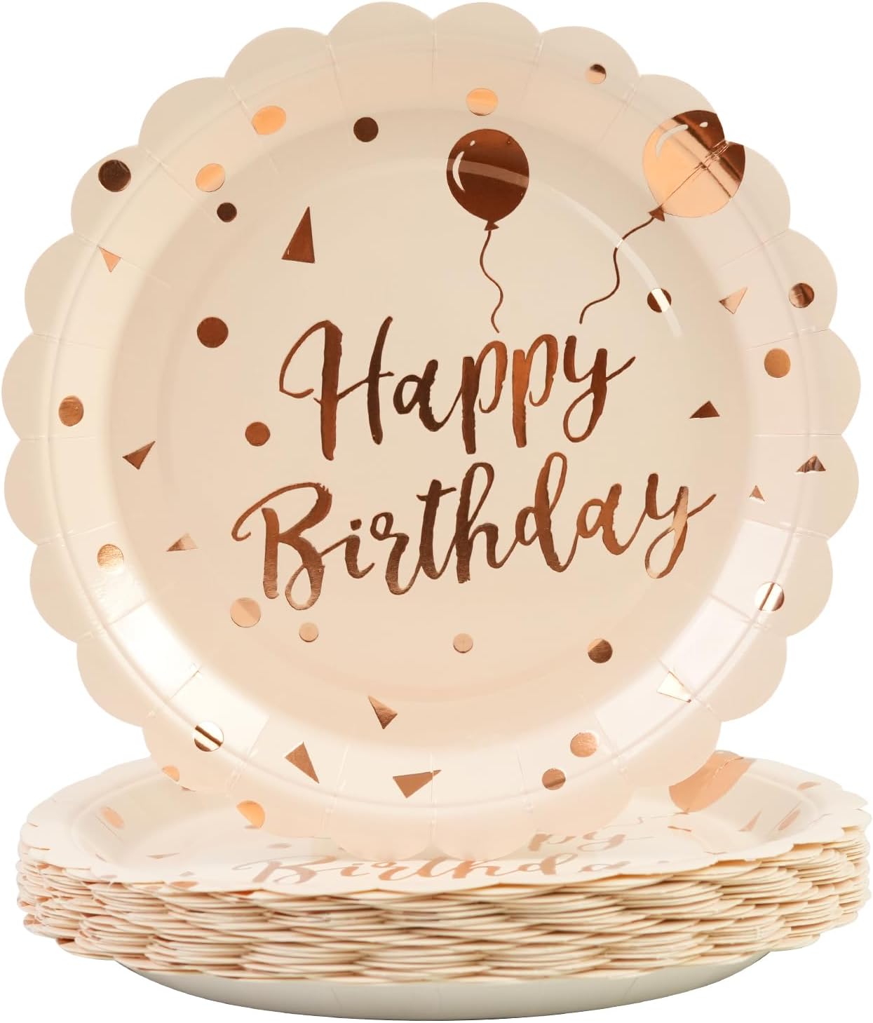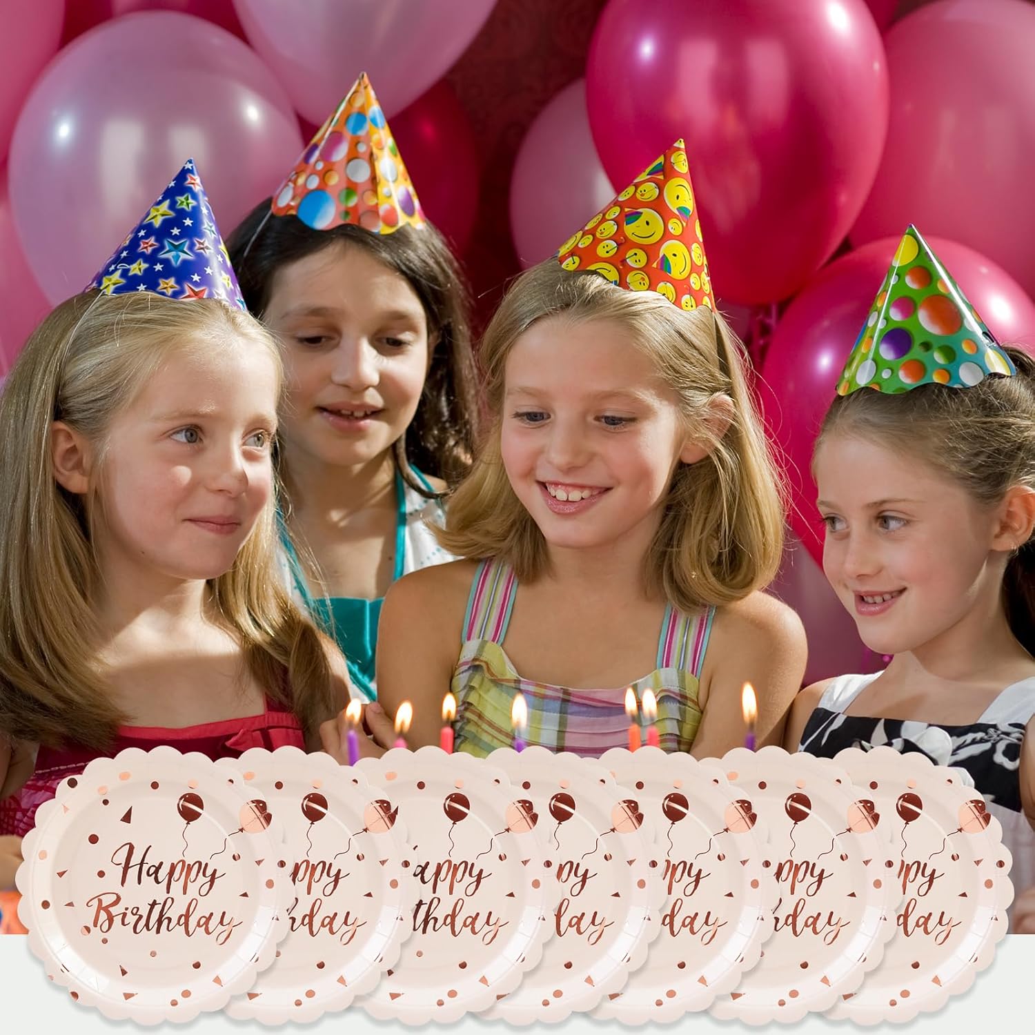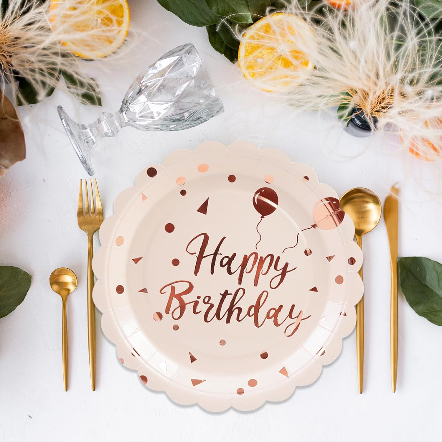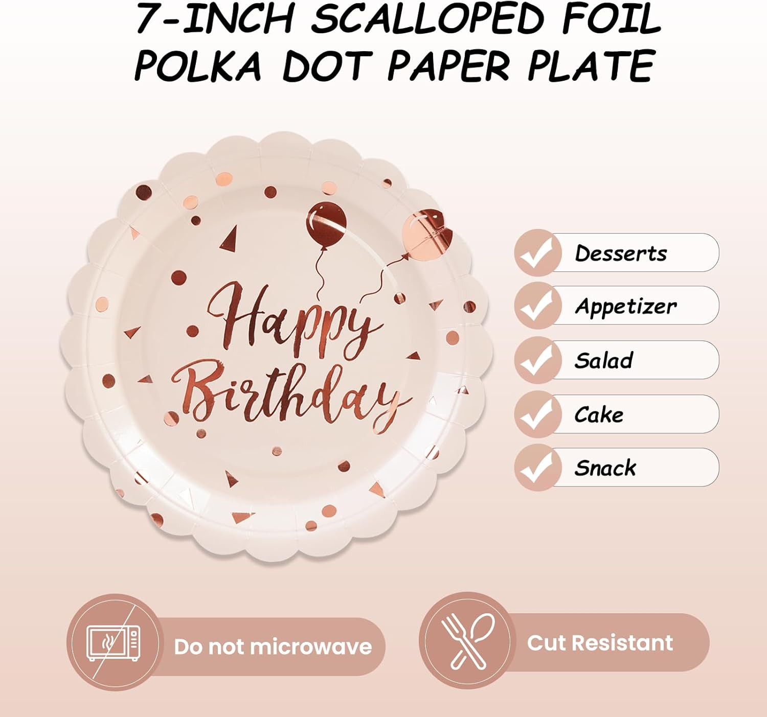 • 【EXQUISITE DESIGN】:Eye-catching gold foil stamping of 'Happy Birthday' in stylish fonts adorns these birthday dessert plates and the rising balloon signifies growing goodness. An elegant rose gold color specially designed for girls and ladies adds a touch of elegance and festivity, making your birthday party table instantly stand out.
