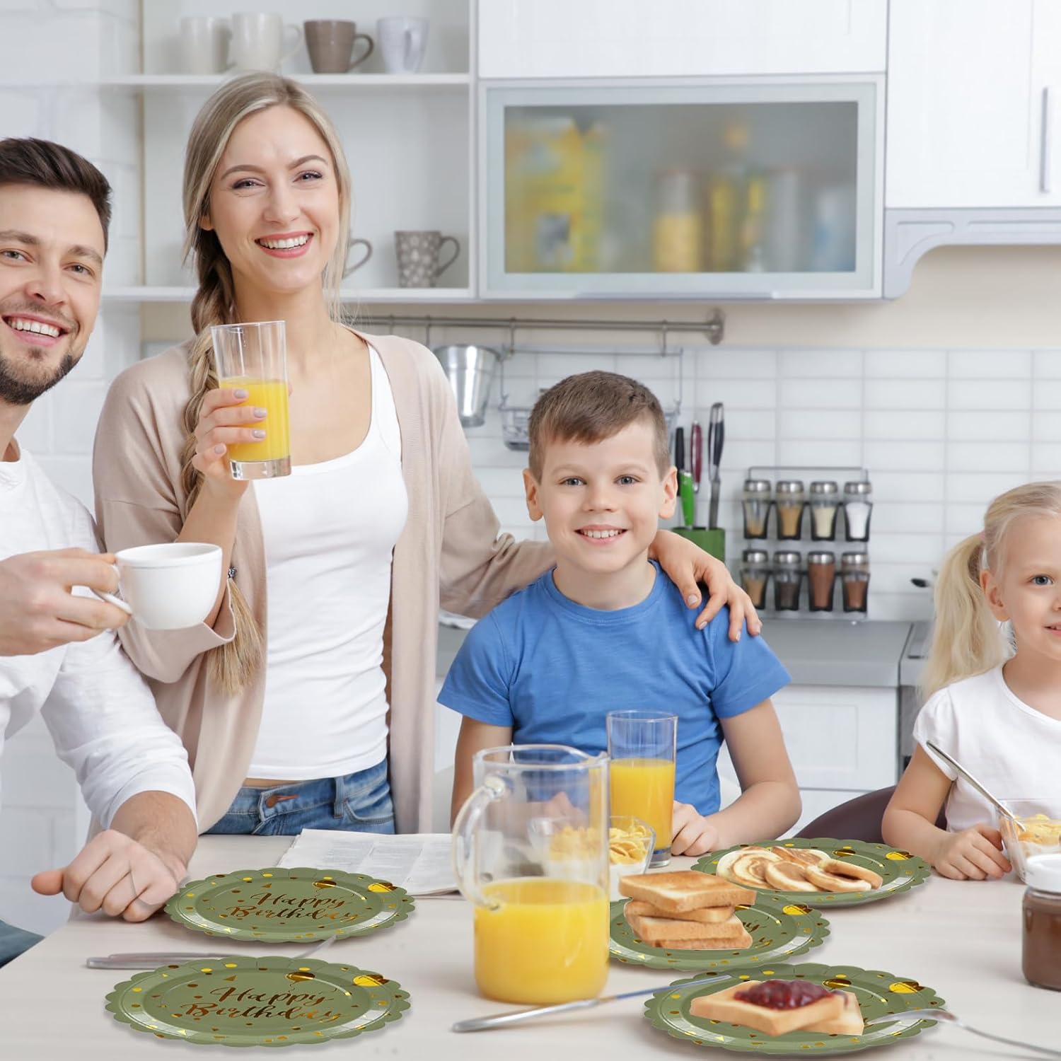 • 【EXQUISITE DESIGN】:Eye-catching gold foil stamping of 'Happy Birthday' in stylish fonts adorns these green dessert plates and the rising balloon signifies growing goodness. It adds a touch of elegance and festivity, making your birthday party table instantly stand out.