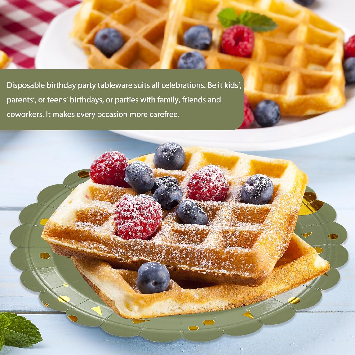 50PCS Sage Green and Gold Happy Birthday Paper Plates, 7 Inch Scalloped Disposable Birthday Dessert Cake Plates Metallic Foil Polka Dots Party Supplies for Birthday's Decorations