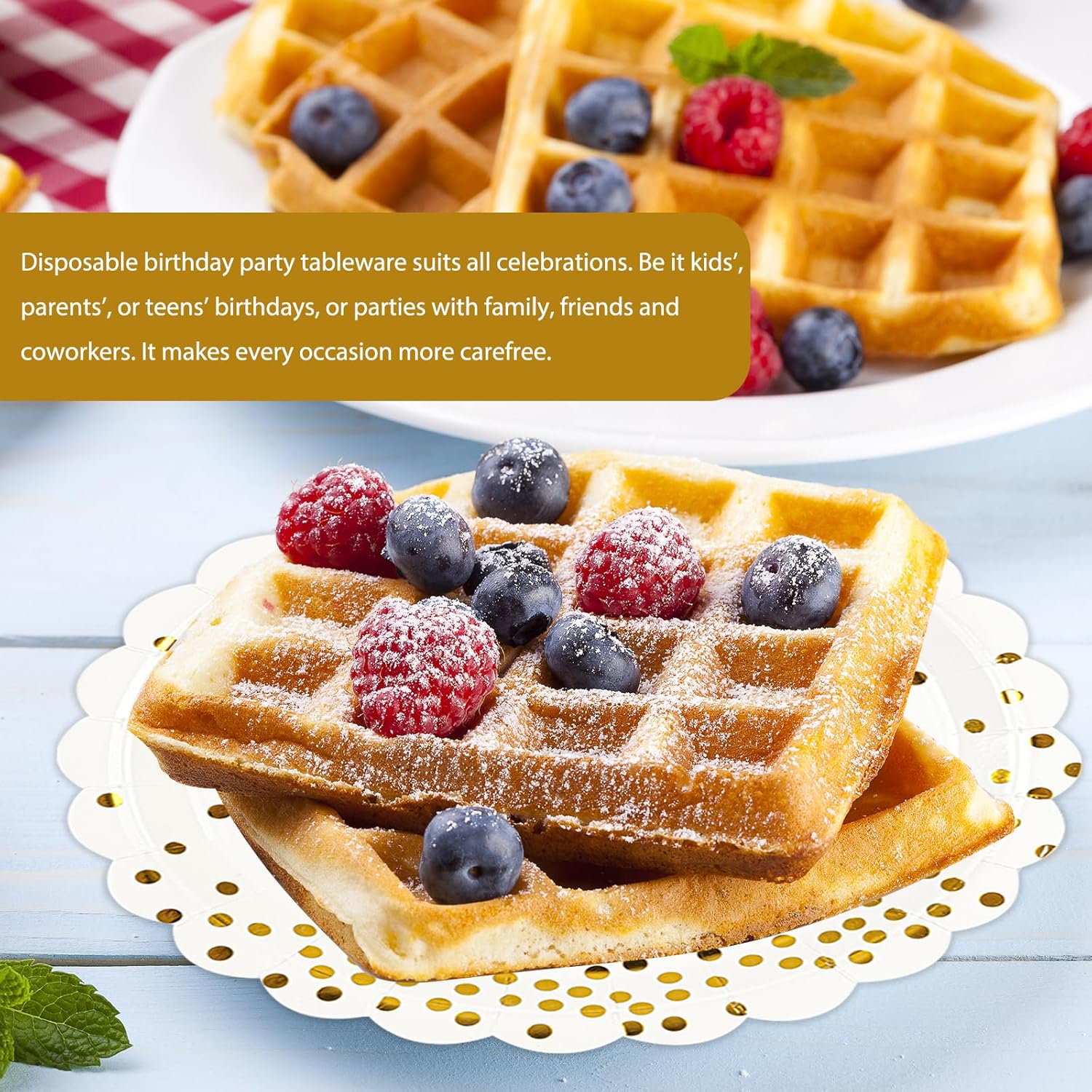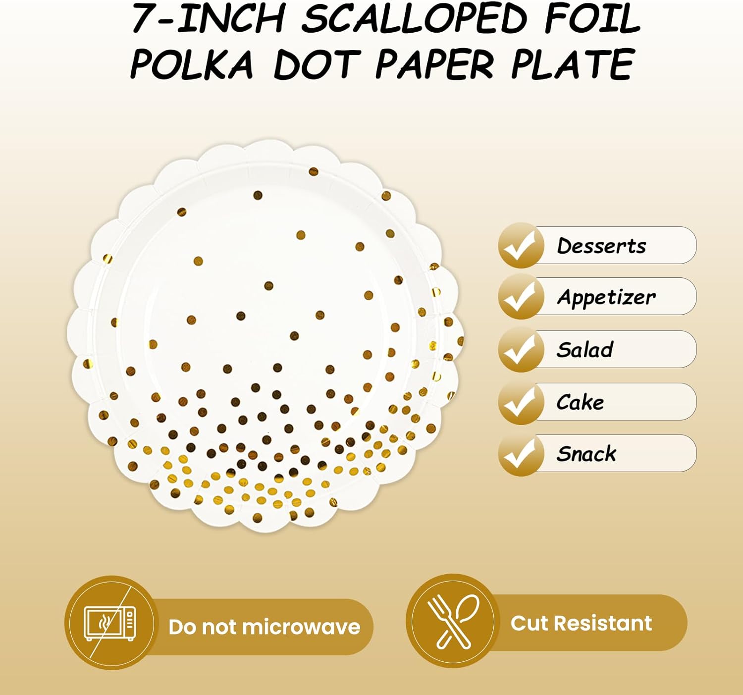 50PCS White and Gold Paper Plates, 7 Inch White Scalloped Party Plates Disposable Dessert Plate Cake Plate for Wedding Engagement Baby Shower Birthday Dinner