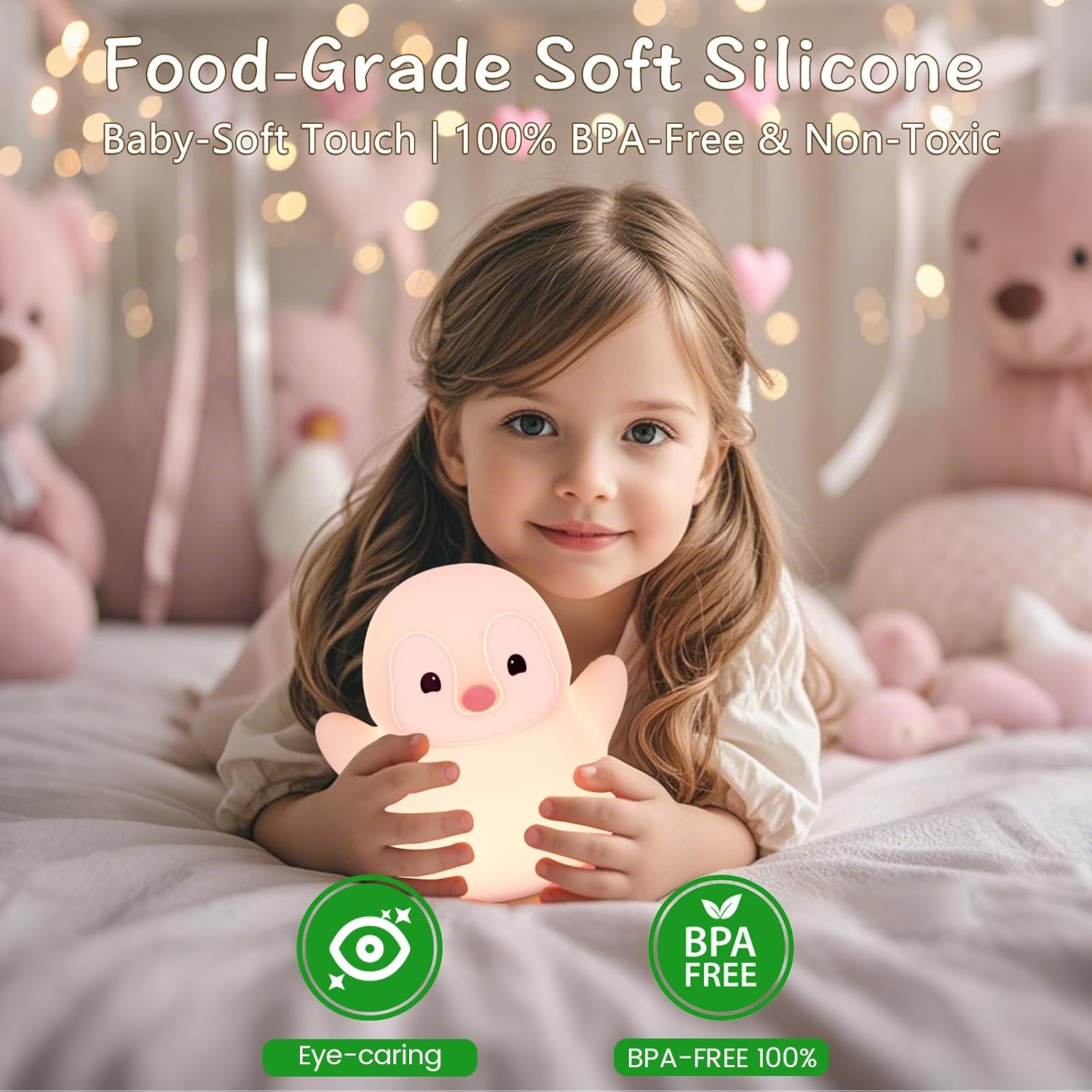 Pink Penguin Night Light,Food Grade Soft Silicone Nursery Nightlight for Baby,LED Squishy Novelty Animal Bedside Lamp,Rechargeable/Dimmable/Timer,Funny Gifts for Kids Girls Adults Teens