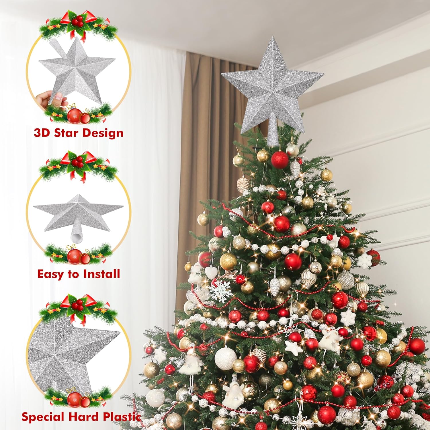 Christmas Tree Decoration, 10" Silver Christmas Tree Topper with Glitter, Large Bethlehem Star Xmas Tree Topper Decor, Waterproof Shatterproof Tree Topper for Christmas Holiday Home Indoor Outdoor