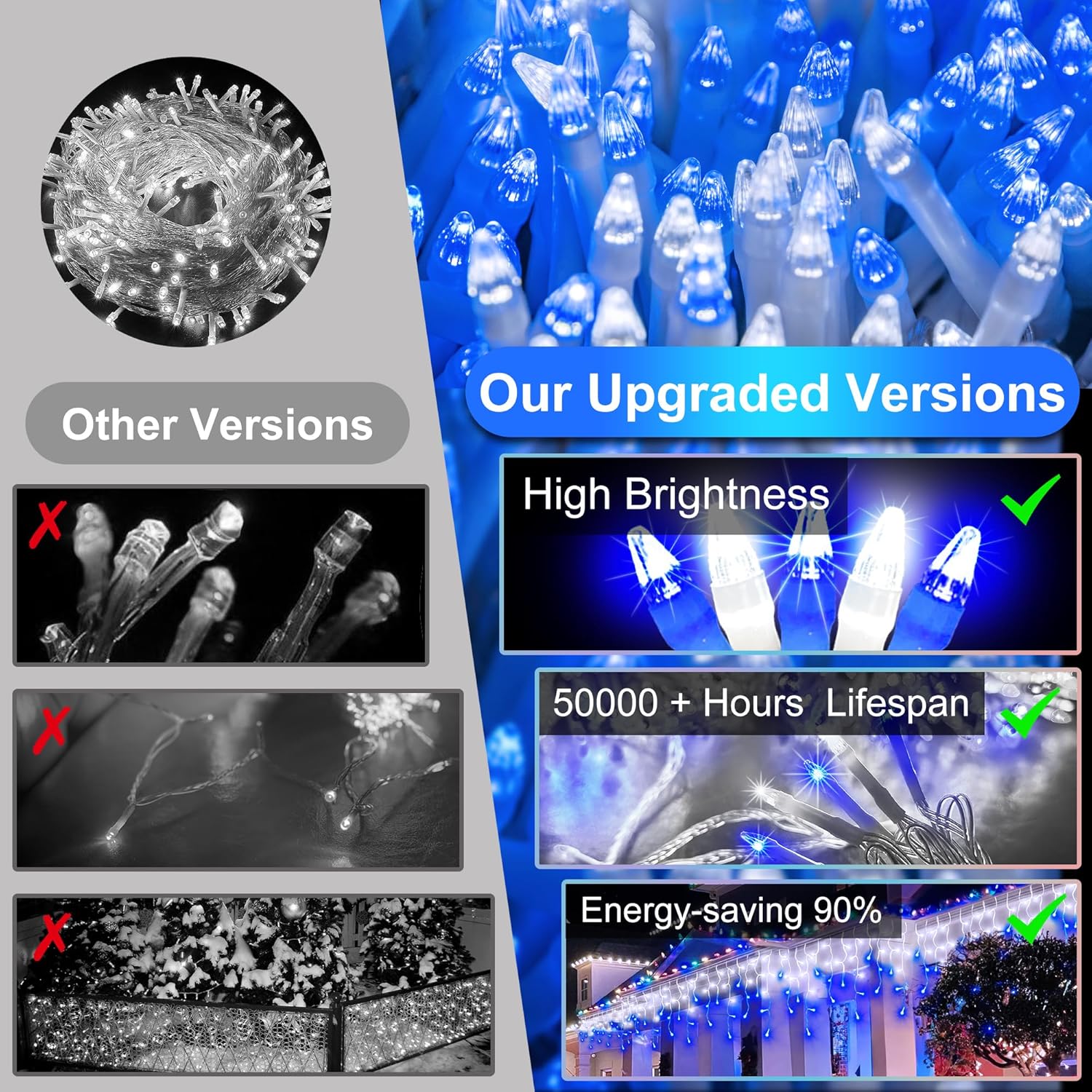 • Twinkle Through Any Winter Weather: Built to handle snow, rain, and icy winds, our outdoor waterproof cool white & blue icicle lights shine strong in any condition. Their frosty glow combines the serenity of blue with the clarity of white, making them perfect for decorating porches, gazebos, or garden arches. Even in the harshest weather, these durable holiday decoration lights keep twinkling, bringing elegance and festive spirit to every corner of your home