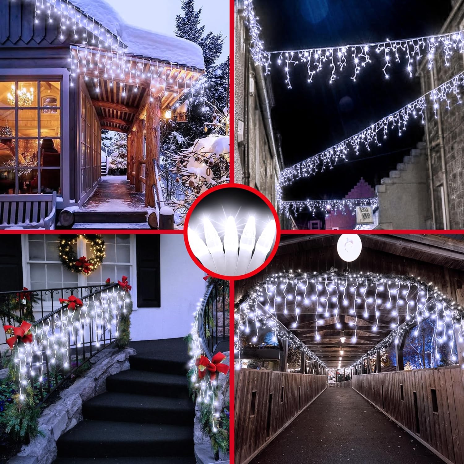• Bring Christmas Magic to Every Corner:Transform your home into a winter wonderland with our 50ft cool white LED Christmas lights featuring 504 LEDs and 112 drops. Their pure and frosty glow makes them perfect for hanging along porches, balconies, rooftops, windows, and even fences. Whether you’re decorating your apartment for a cozy holiday atmosphere or lighting up your backyard patio for festive gatherings, these outdoor waterproof icicle lights instantly create an elegant snowy vibe