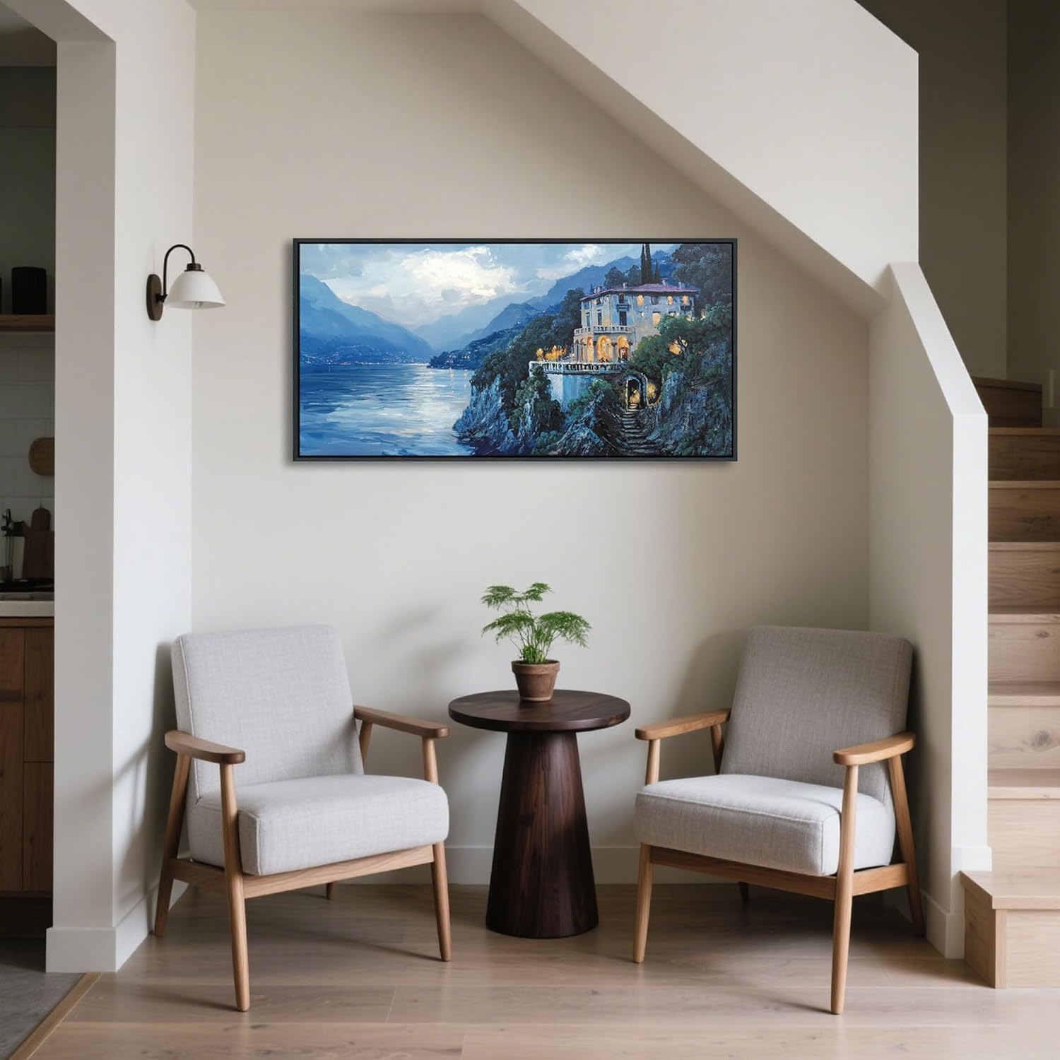 • Wall Art for Living Room: This oil paintings showcases a captivating scene of a lakeside villa bathed in warm lights against a backdrop of mountains and water. The rich, vivid colors and masterful brushstrokes create a lifelike and immersive view that can transform any room into a tranquil retreat.