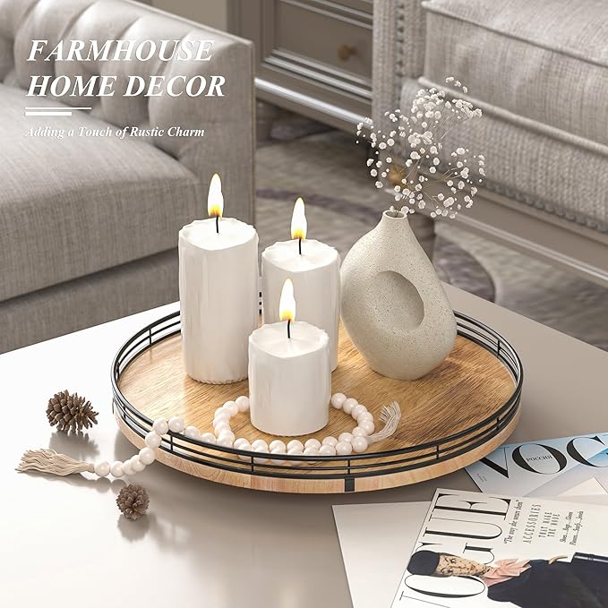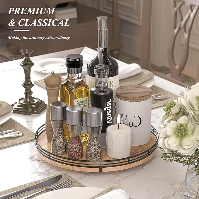 • PREMIUM MATERIAL: Our farmhouse lazy Susan organizer is made of natural solid oak wood and strong metal, sturdy, durable and premium quality. This wooden turntable organizer is a game-changer for keeping your kitchen organized. The farmhouse oak finish gives it a rustic, charming look that will fit perfectly with your kitchen decor.