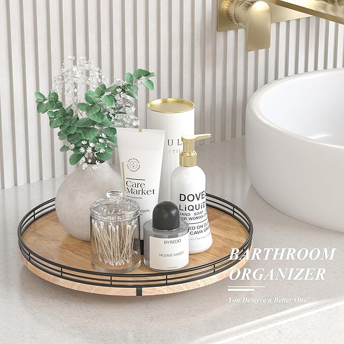 • UPDATED DESIGN: With larger wood base on this lazy Susan for table top, the turntable organizer doesn't wobble, even with heavier items on it. With premium oak wood and classical iron fence make this lazy Susan turntable stylish, functional and adding a touch of rustic charm. it’s also very easy to clean. There are included anti-slip pads on the bottom of the lazy Susan for extra surface protection.