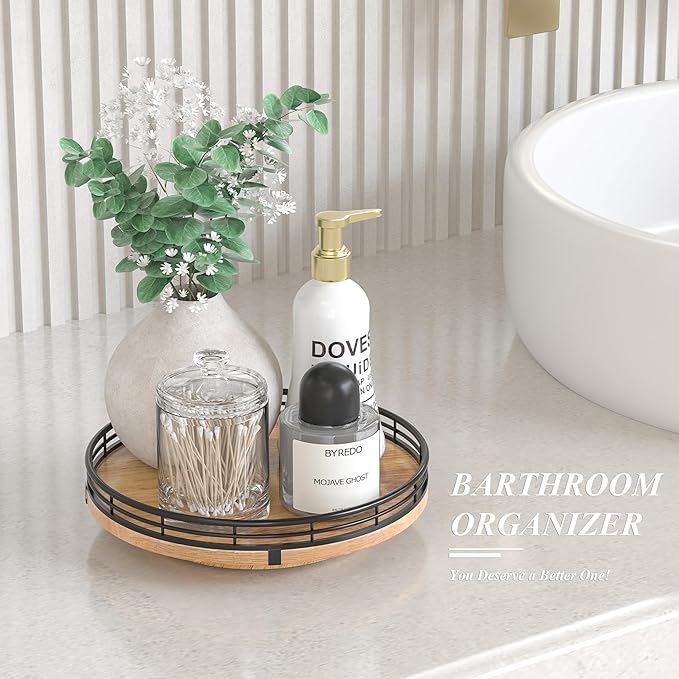 • UPDATED DESIGN: With larger wood base on this lazy Susan for table top, the turntable organizer doesn't wobble, even with heavier items on it. With premium oak wood and classical iron fence make this lazy Susan turntable stylish, functional and adding a touch of rustic charm. it’s also very easy to clean. There are included anti-slip pads on the bottom of the lazy Susan for extra surface protection.