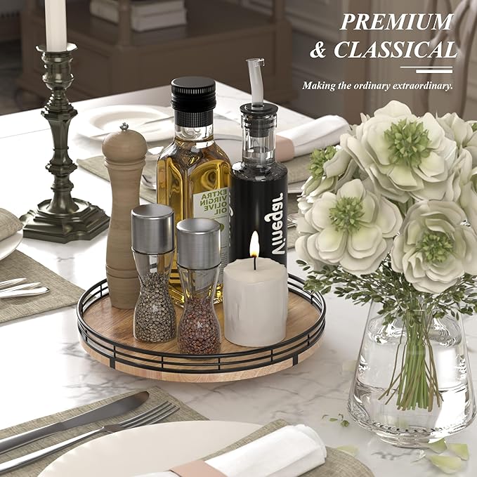 • UPDATED DESIGN: With larger wood base on this lazy Susan for table top, the turntable organizer doesn't wobble, even with heavier items on it. With premium oak wood and classical iron fence make this lazy Susan turntable stylish, functional and adding a touch of rustic charm. it’s also very easy to clean. There are included anti-slip pads on the bottom of the lazy Susan for extra surface protection.