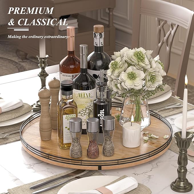 • UPDATED DESIGN: With larger wood base on this lazy Susan for table top, the turntable organizer doesn't wobble, even with heavier items on it. With premium oak wood and classical iron fence make this lazy Susan turntable stylish, functional and adding a touch of rustic charm. it’s also very easy to clean. There are included anti-slip pads on the bottom of the lazy Susan for extra surface protection.