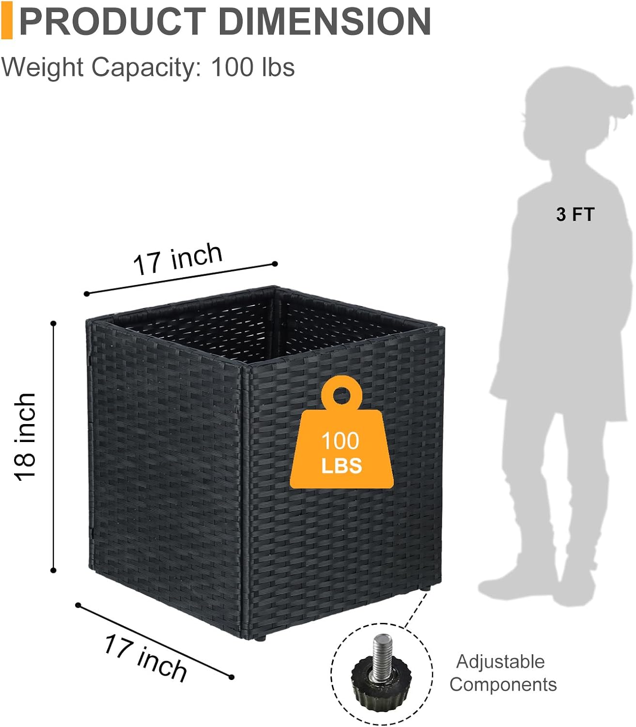 • Product Details - Dimensions (LxWxH) Plant pot: 17 x 17 x 18 inch Material: PE rattan, Powder-coated Steel, Plastic , Adjustable Feet
