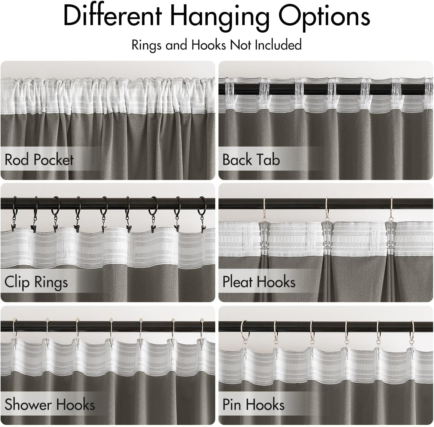 • HANGING OPTIONS: Each curtain panel has 3-in-1 top style design: rod pocket, back tab and pinch pleat. Back loop (2.3 inch) and rod pocket (3.1 inch) fit most standard rod. Curtains also can be hung with clip rings or curtain hooks. 3 ways to meet your various needs.