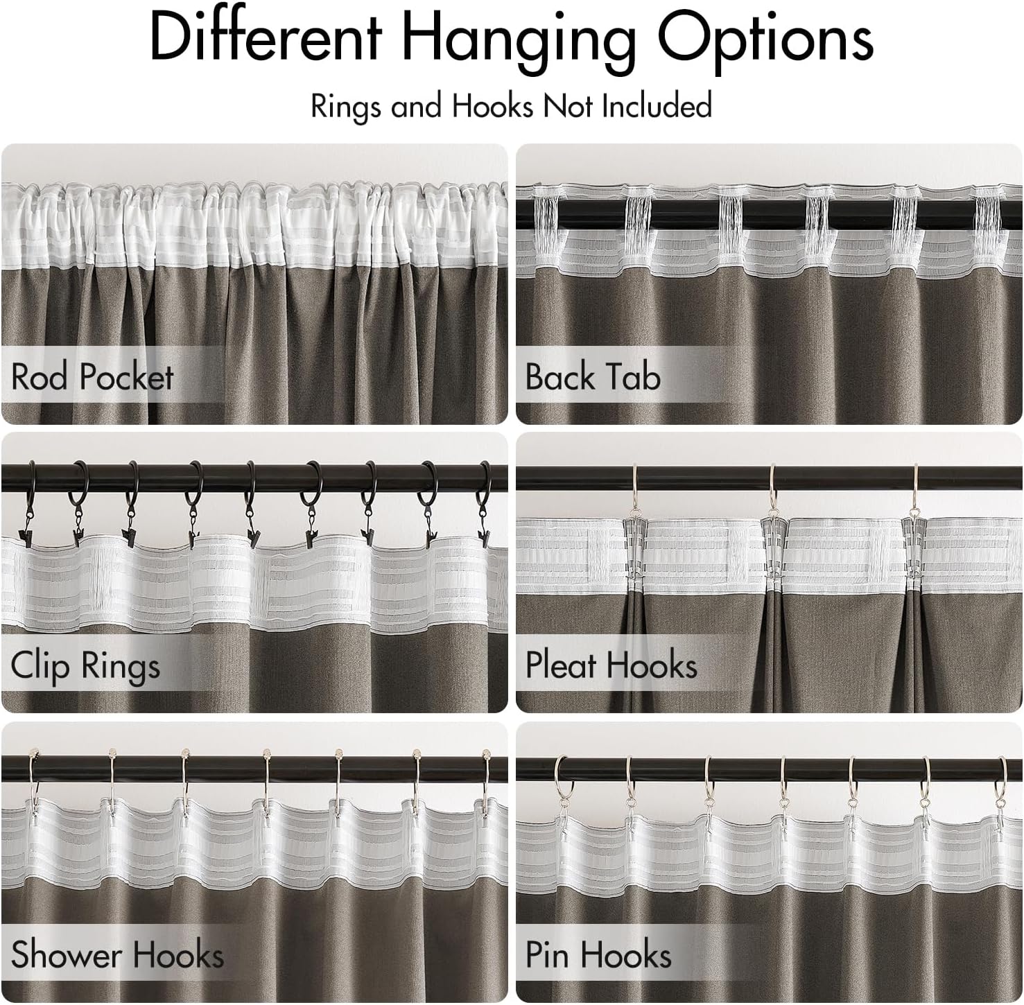 • HANGING OPTIONS: Each curtain panel has 3-in-1 top style design: rod pocket, back tab and pinch pleat. Back loop (2.3 inch) and rod pocket (3.1 inch) fit most standard rod. Curtains also can be hung with clip rings or curtain hooks. 3 ways to meet your various needs.