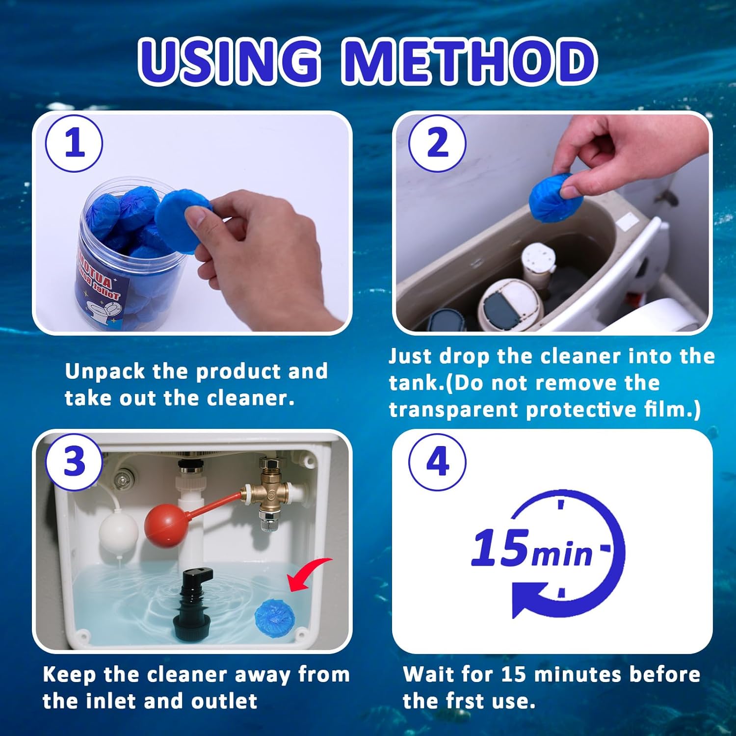 • EASY TO USE: Simply take one blue toilet tablet out of the box and place it in the toilet tank. Then, let it fully dissolve for at least 20 minutes until the water turns blue before flushing. (Please note, do not remove the water-soluble blue protective film) It will not cause any damage to the inside of the septic tank and toilet tank.