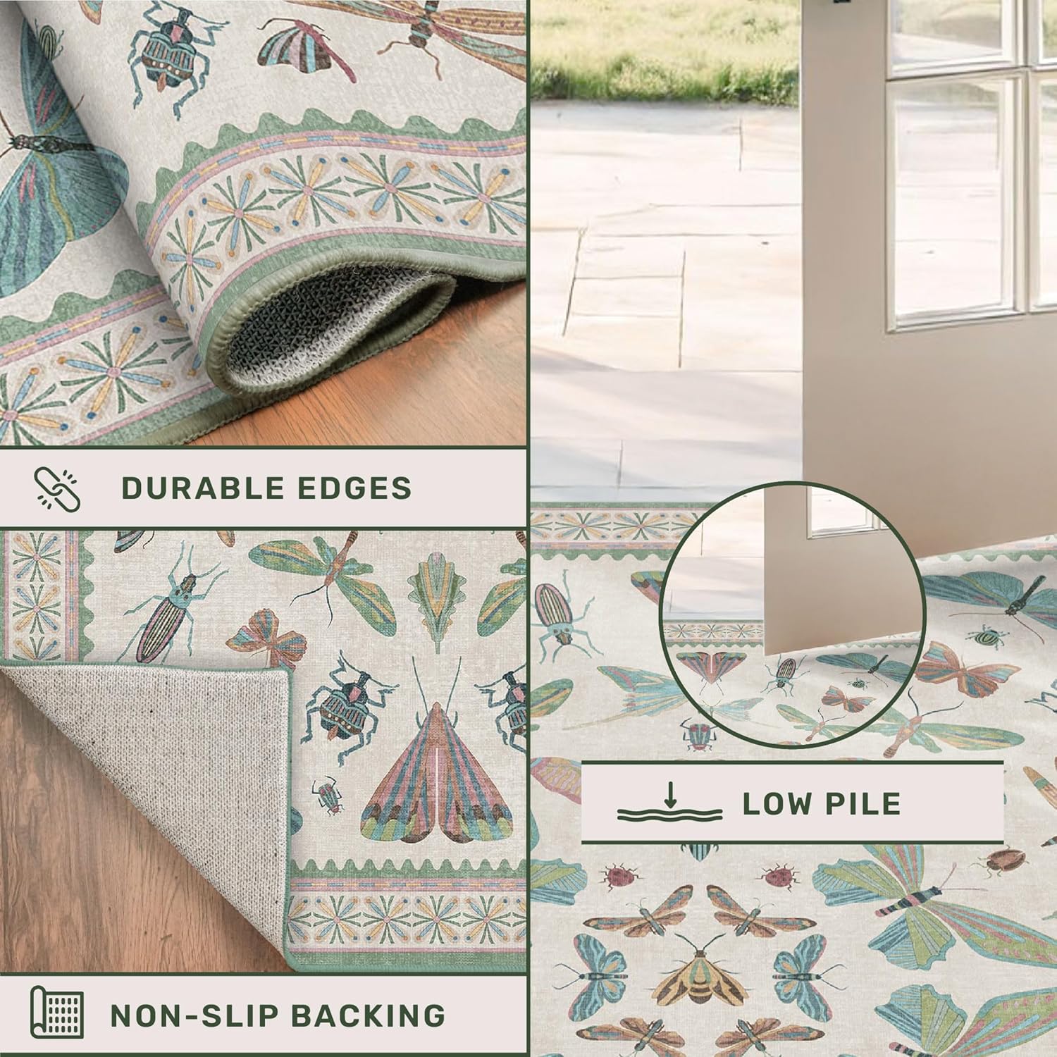 Washable Boho Bathroom Rug 2x3, Small Throw Rugs for Kitchen, Powder Room, Front Door Indoor Entrance, Non Slip Low Pile Stain Resistant, Dusty Green Colorful Cool Insect Aethestic