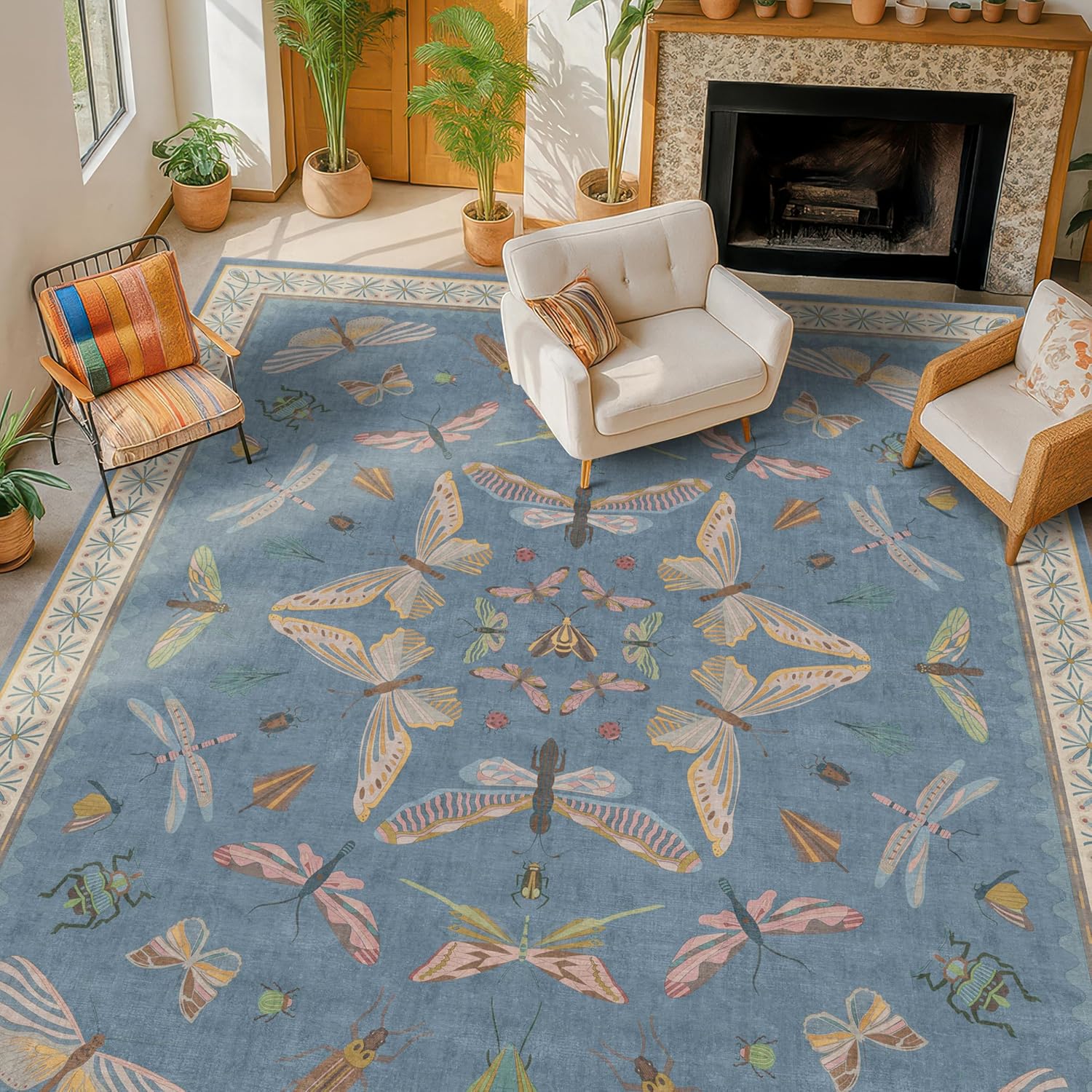 • Playful Nature-Inspired Design: Bursting with charm, this area rug features a whimsical display of butterflies, moths, beetles, and bugs, arranged in a symmetrical kaleidoscope pattern. The vivid blue background sets a lively stage for the detailed insect illustrations in cheerful tones of orange, pink, green, and lemon yellow. A scalloped edge surrounds the insect field, framed by a soft cream floral border that adds a handcrafted, vintage-inspired touch