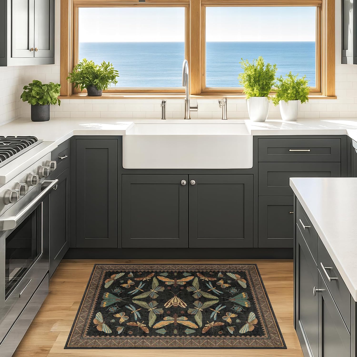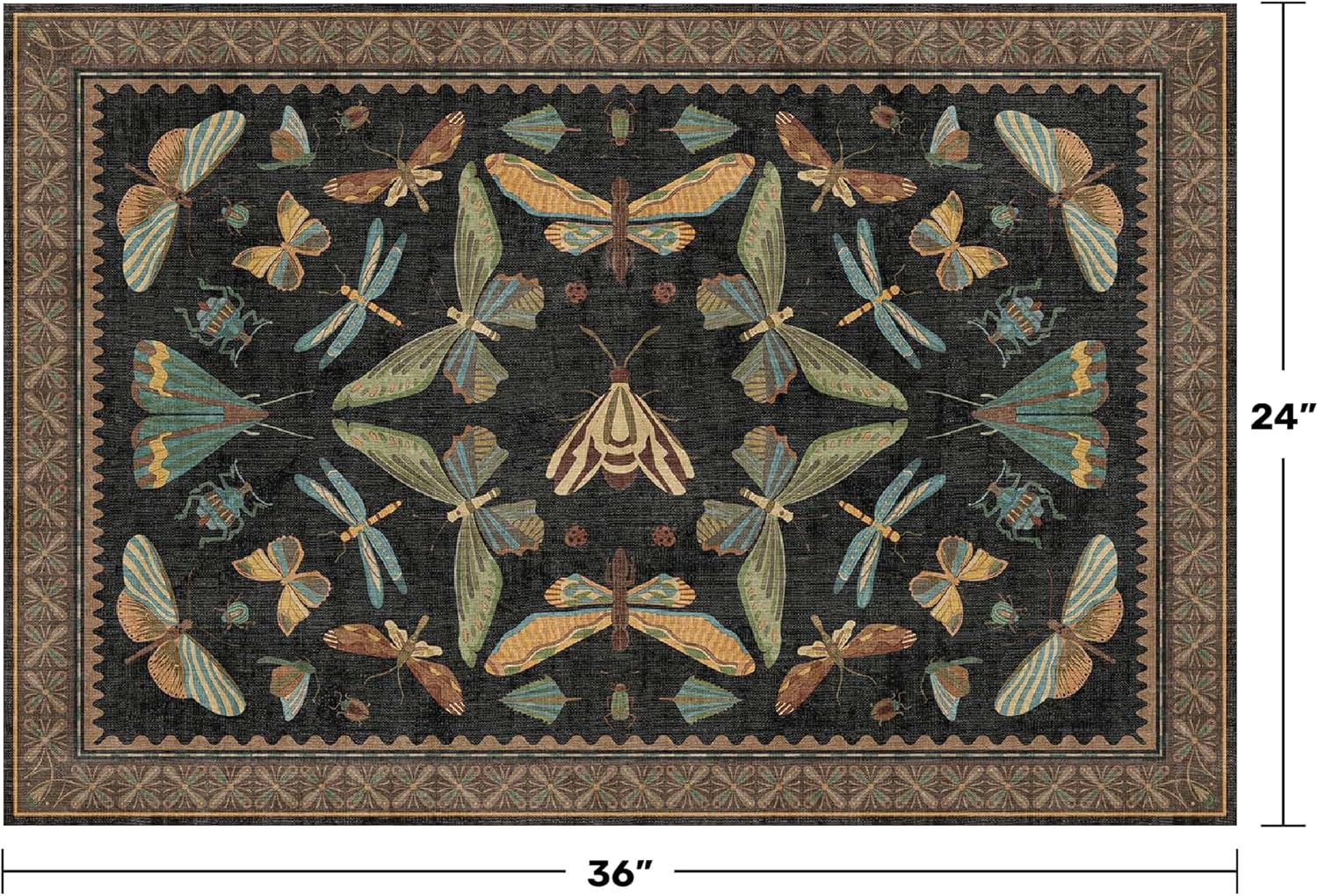 • Eclectic Vintage Charm: Make a bold statement with this insect-themed area rug, set against a black and brown background. Intricate illustrations of moths, butterflies, and dragonflies shine. Earthy tones of mustard, teal, sage green, rust, and pale blue give a warm, vintage feel. The symmetrical arrangement and scalloped interior edge bring to mind classical natural history art, while the stylized floral border adds a handcrafted touch. Ideal for antique, boho, or cottage-inspired interiors