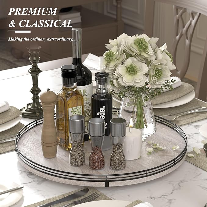 • PERFECT GIFTS: This wooden tray can not only be served as a lazy Susan to organize, but also be served as a decorative tray to decor your coffee table, dining table, kitchen, home with its charmed rustic farmhouse style. Perfect for a wedding, Birthday, housewarming gift, Mother's Day gift, or centerpiece for any occasions. Tastefully packaged, our turntable organization makes a thoughtful and practical gift for someone who loves home organization and home decoration. No assembly was required.
