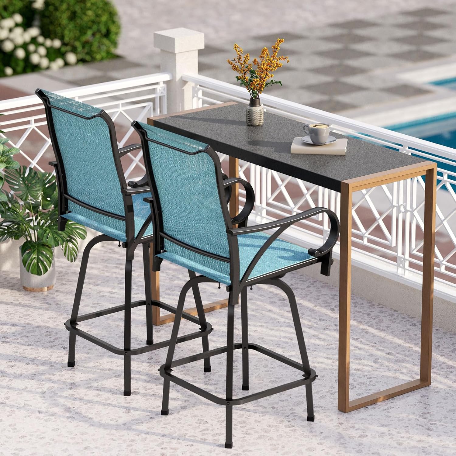 • 360° Swivel Outdoor Bar Stools: Patio bar stools have ergonomic high backrests and premium quick dry Textilene fabric seats (waterproof). Supports 300 lbs per stool