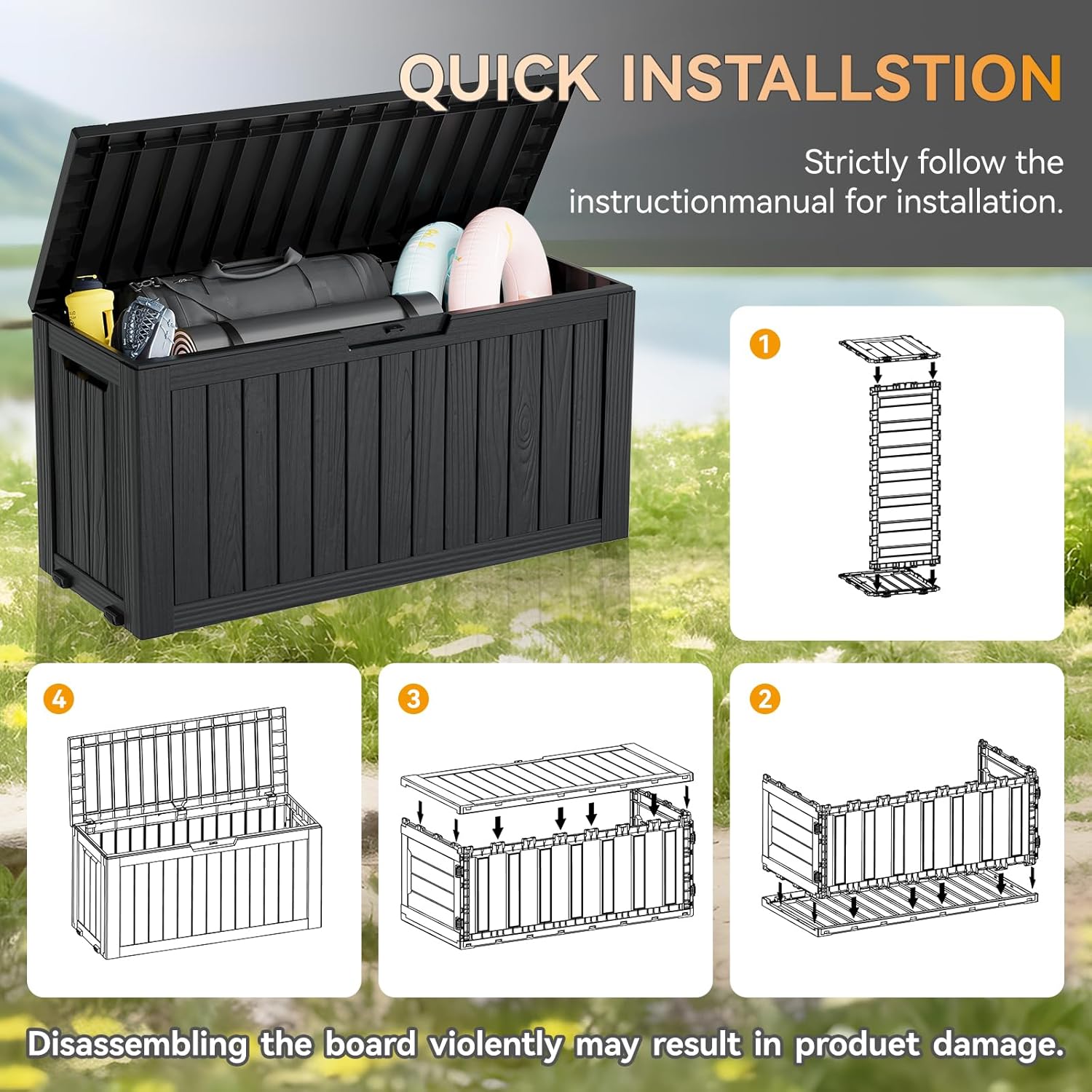 • Deck Boxes Outdoor Waterproof: Designed as a waterproof storage solution, this deck box protects your belongings from moisture and ensures they stay dry even during heavy rain. The lockable lid adds an extra layer of security, keeping your valuables safe from theft or damage.