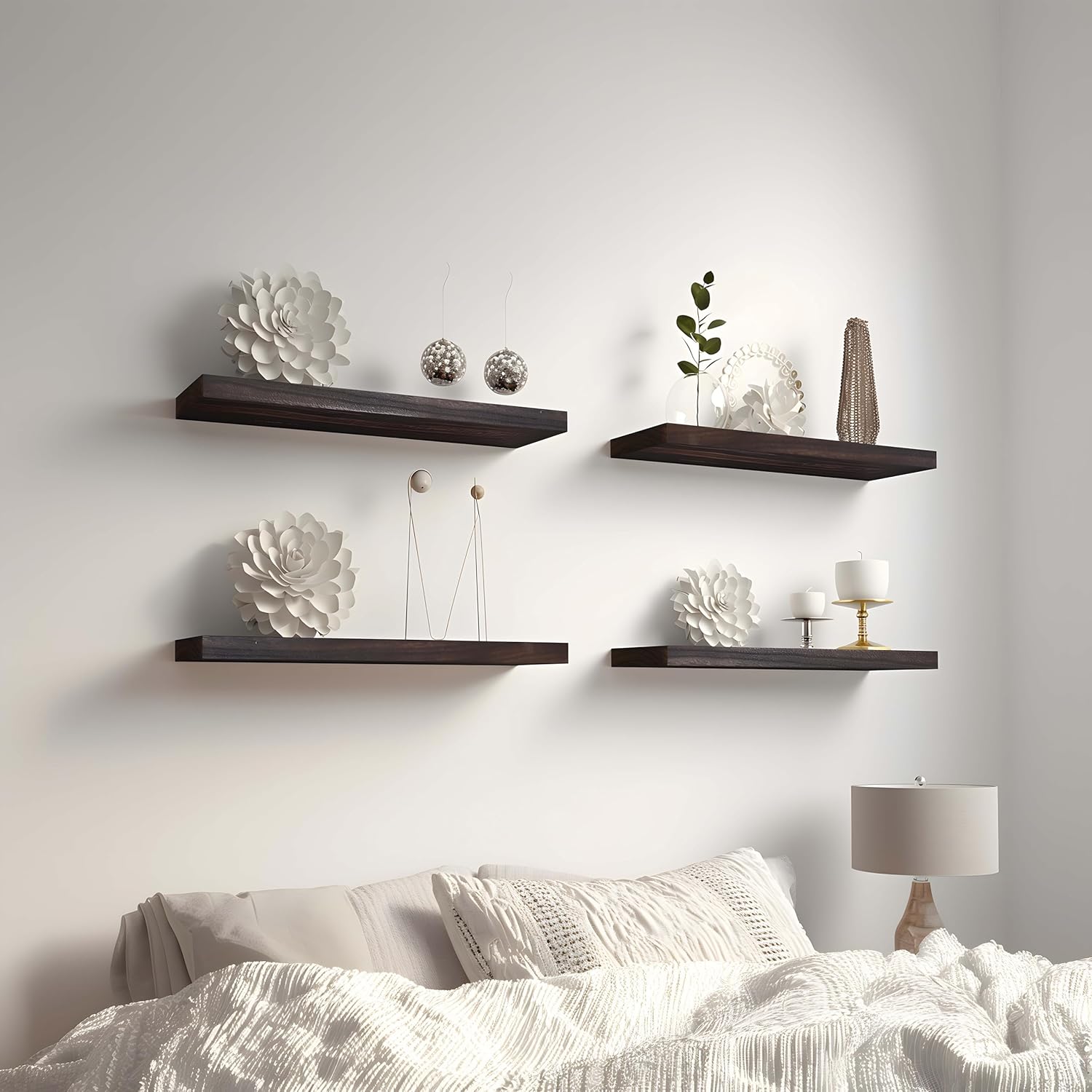 • BEAUTIFUL FLOATING SHELVES - The style and finish of these floating shelves can match almost all themes in your home. Ideal home decor to organize bathroom, office, bedroom, living room, kitchen.