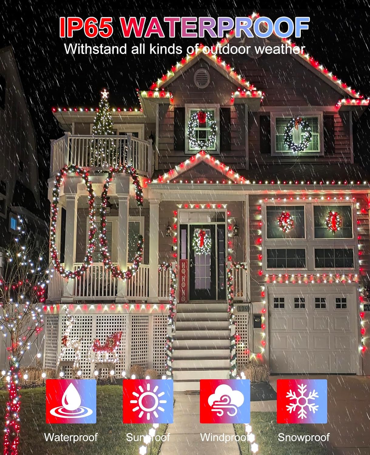 • 【IP65 Waterproof Outdoor Decoration】With IP65 waterproof design, the Christmas tree lights can work properly in windy, rainy and snowy weather, suitable for year-round use. Perfect for Christmas, Halloween, party, wedding, birthday, yard, roof, door, restaurant, shopping center, stage decorations. But please keep the adapter away from water.