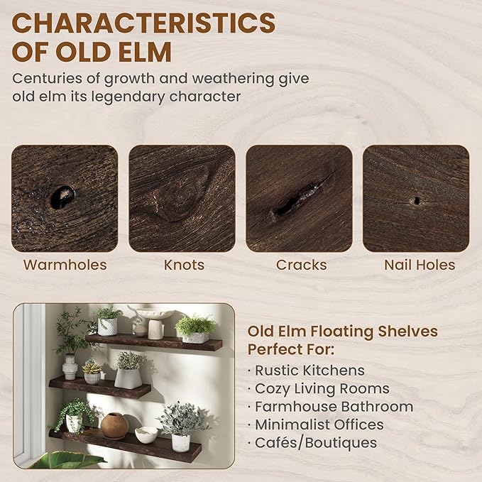 • REAL SOLID ELM WOOD: These elegant elm wood floating shelves showcase the natural beauty of solid timber with a clean, minimalist design. The rich, warm tones and distinctive grain patterns of elm create organic visual interest, while the smooth, sanded surface offers a soft tactile feel.