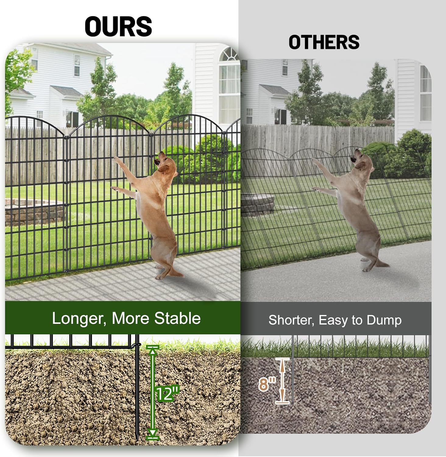 • STURDY AND STABLE: This tall garden fence 48 inches is welded by Gauge 9 thickness iron wires, the stakes are 10mm in diameter, and can be extended pretty far into the ground which is fairly steady, it works well as a garden fence border for big or medium size dogs.