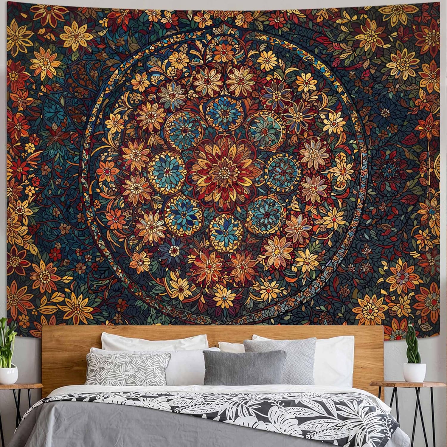 Fowocu Boho Floral Mandala Tapestry Wall Hanging Vintage Bohemian Flower Medallion Tapestry Aesthetic Orange Stained Glass Hippie Large Tapestries for Bedroom Living Room Dorm Decor 80 x 60 Inch