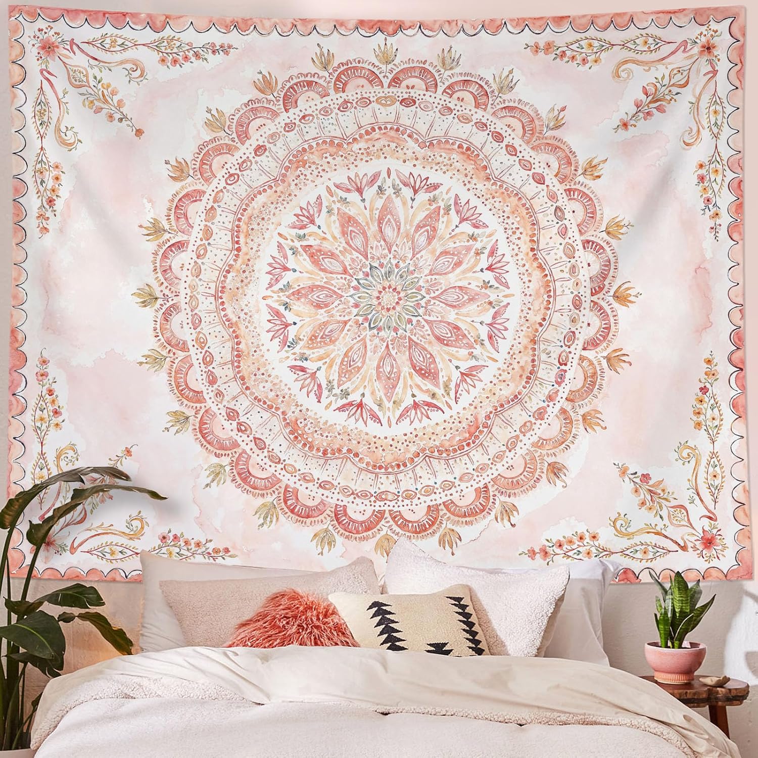 Fowocu Boho Floral Mandala Tapestry Wall Hanging Pink Bohemian Flower Medallion Tapestry Aesthetic Watercolor Hippie Indian Large Tapestries for Bedroom Living Room Dorm Decor 80 x 60 Inch