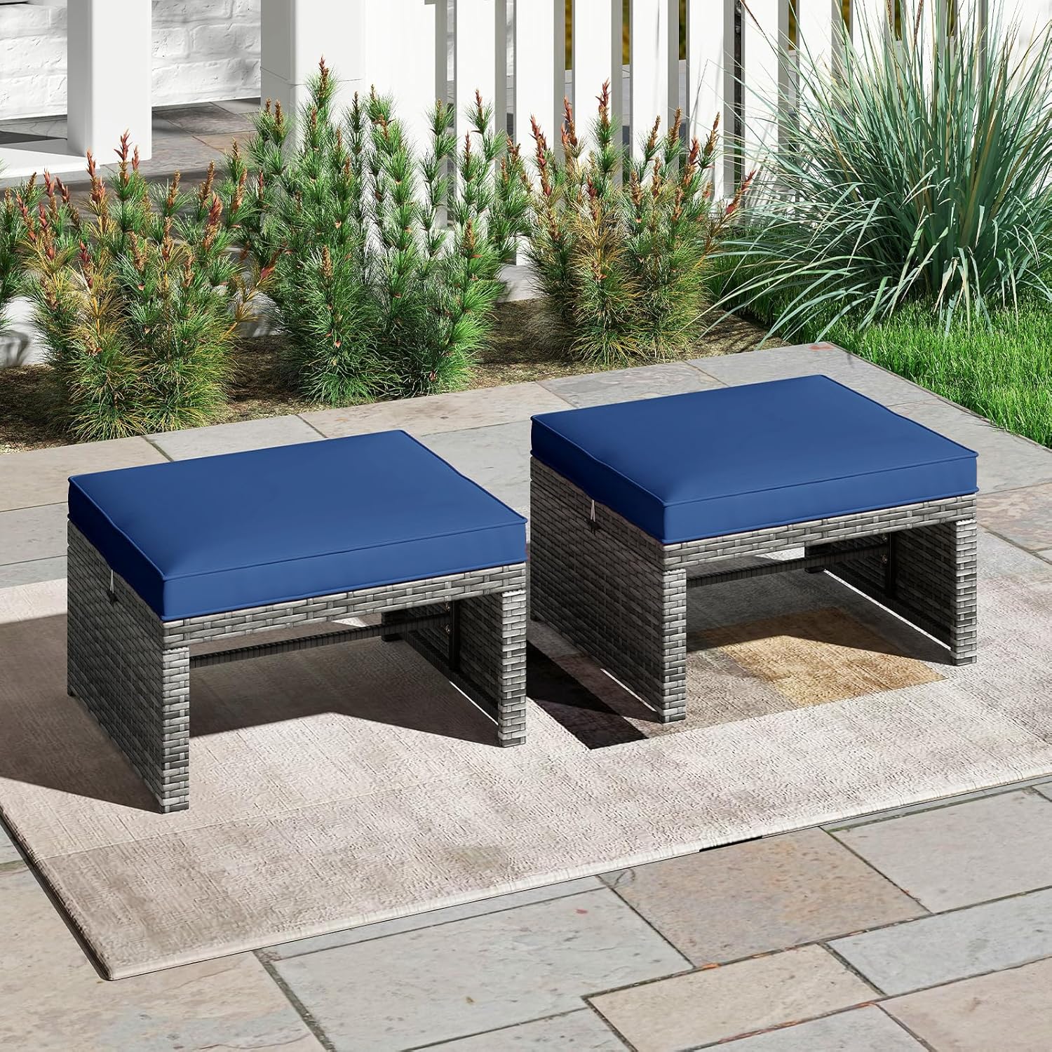 Tangkula 2 Pieces Patio PE Rattan Ottomans, Multipurpose Outdoor Footstool Footrest Additional Seating Side Table with Soft Zippered Cushions for Deck, Garden, and Yard (Navy Blue)