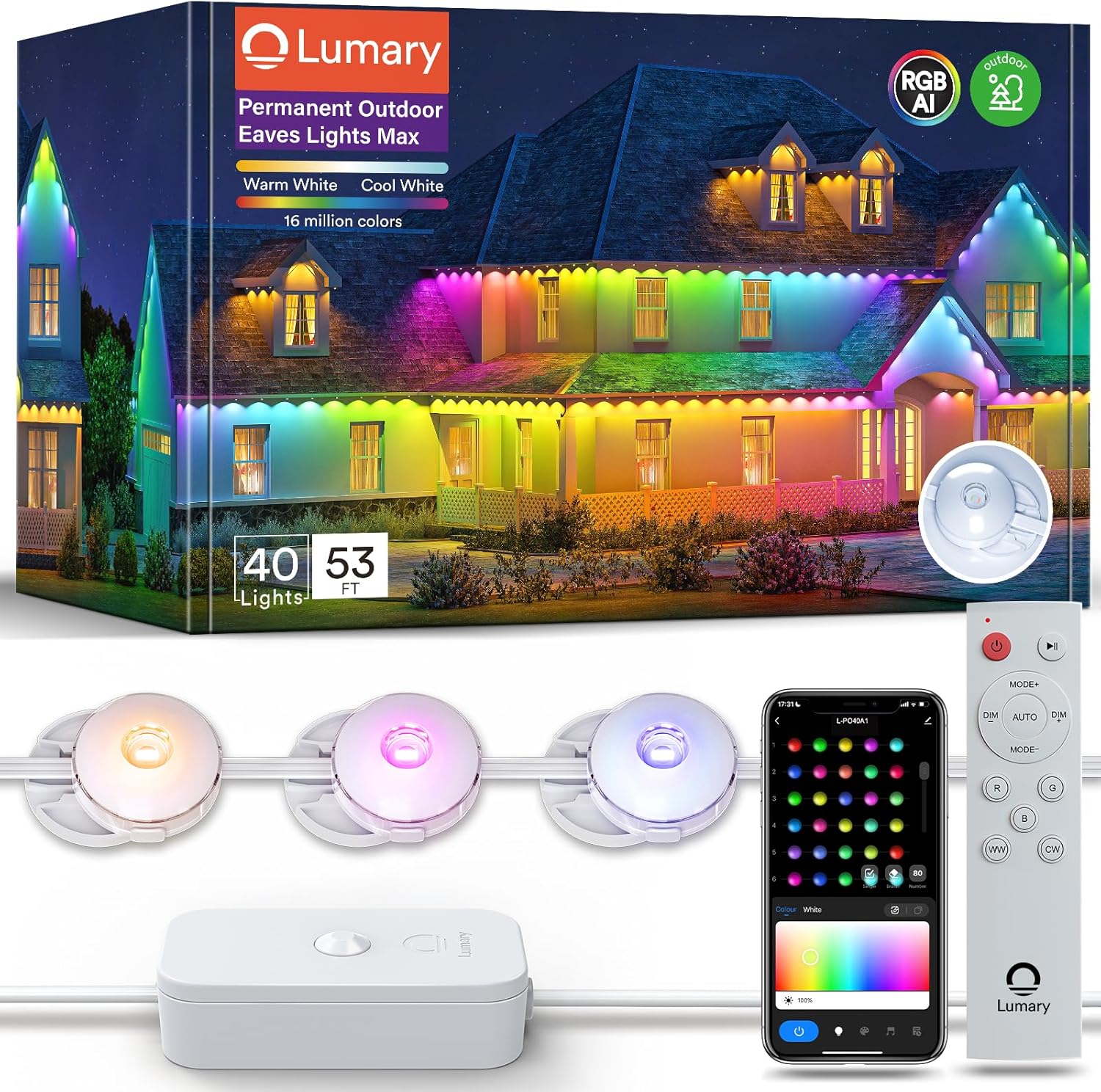 Lumary Permanent Outdoor Lights Max 53ft with 40 LED Eave Lights RGBAICW 2400LM, IP67 Waterproof, IC Control and Scene Modes for Halloween Christmas Decoration, Works with Alexa and Google Assistant