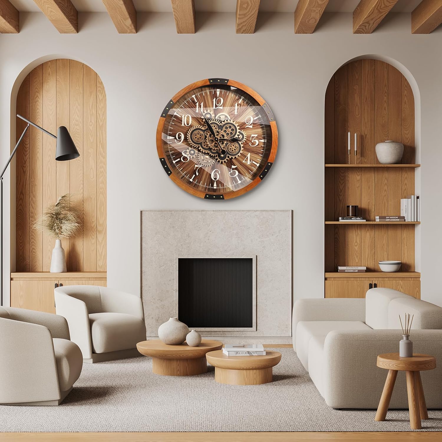Wall Clocks for Living Room Decor, Large Real Moving Gears Clock, Vintage Industrial Oversized Rustic Farmhouse Kitchen Office Fireplace Wall Decor (Brown, 27 inch)