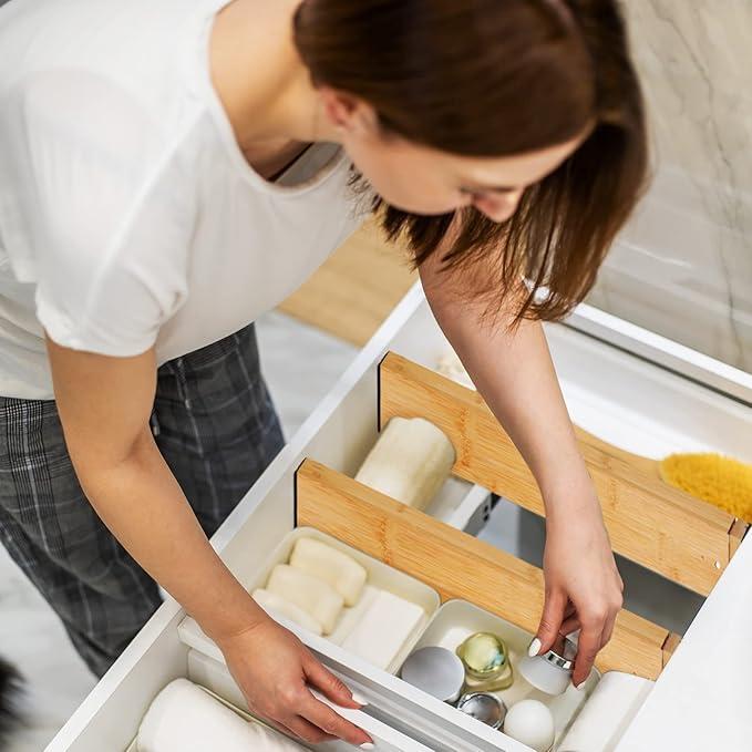 • Package Includes: you will receive 6 bamboo kitchen drawer dividers and 1 bamboo expandable drawer organizer; These can be installed in your kitchen, bedroom, living room, bathroom, closet, desk, and office drawers; Effortlessly separate items and keep your drawers clean and tidy with this versatile set