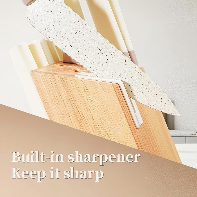 • 【HIGH-CARBON STAINLESS STEEL EXCELLENCE】 Our knife block set HRC 56-58 forged blades maintain razor-sharp edges 3x longer than standard knives. White ceramic-coated provides 360° corrosion resistance, outperforming traditional stainless steel by 68% in salt spray tests. Ideal for daily use or prolonged storage.