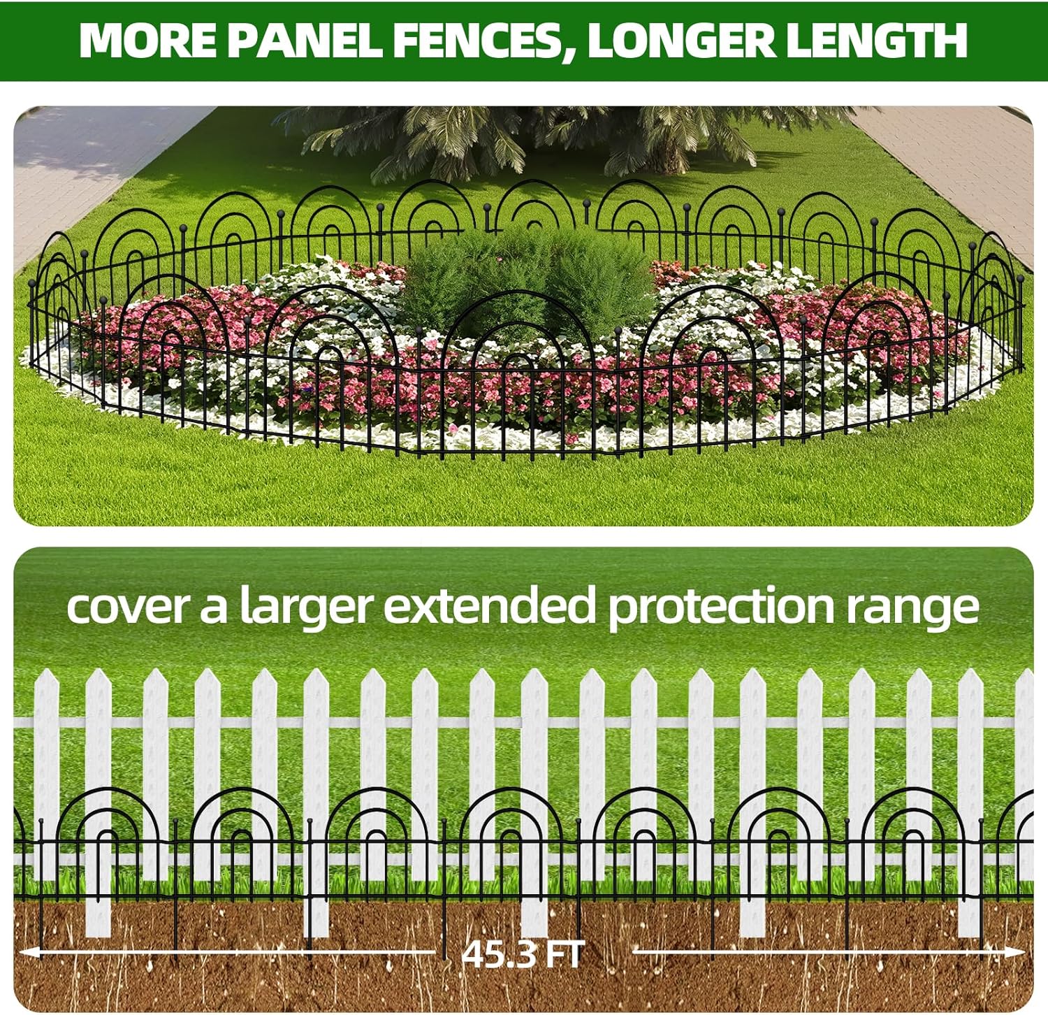 • Longer Size: Each piece of the garden fence barrier is 17" long and 13" high. The entire length of the 32 panels fence set is 45.3 feet long! Under same quantity, longer garden can be connected to make a larger fence, can be extended to different shapes according to your special uses. They can be arranged in one straight line, a curved shape, 'L', 'O' or zigzag shape, fence panels can be adjusted to uneven terrain