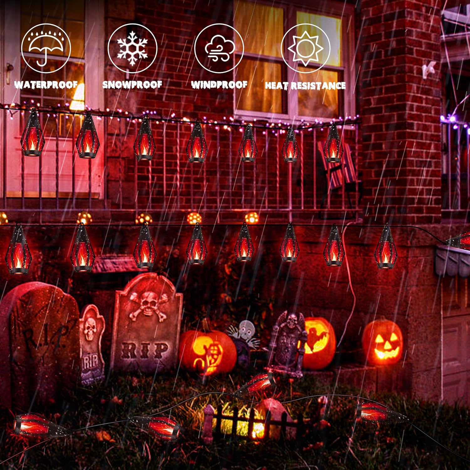 • Flickering Dancing Flames String Lights: iBaycon solar Halloween string lights feature a stunning dancing flame design, offering a realistic flame effect that adds a charming ambiance to any setting