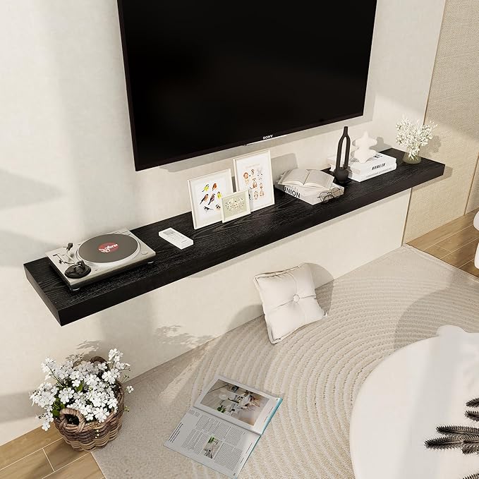 • 【12 INCH DEEP FLOATING SHELF】This extra deeper and thicker wall shelves are 12 inches in depth and 2 inches in thickness instead of the regular narrow floating shelves, you can put photos, pictures, DVD players, videos, books, toys, and some other knickknack on this beautiful display wooden shelf.