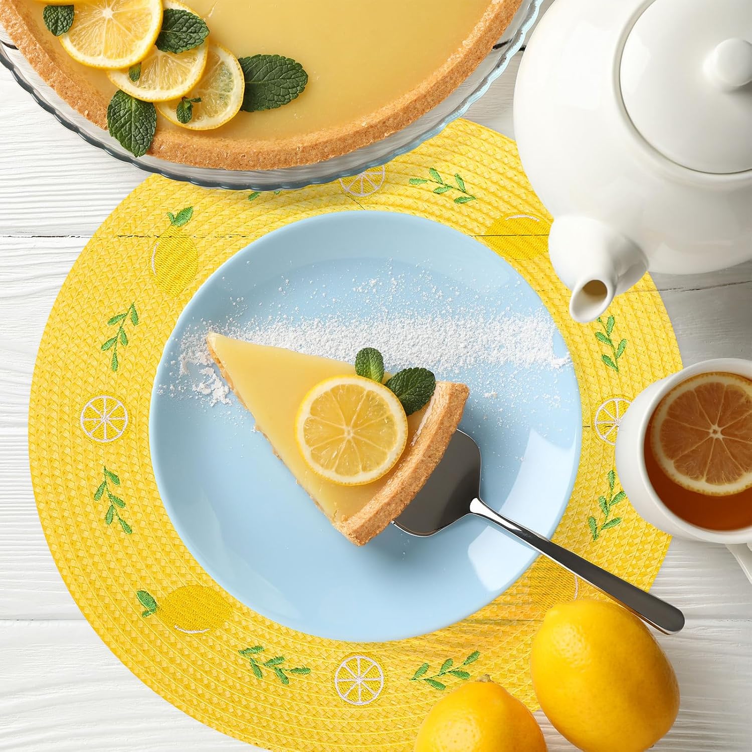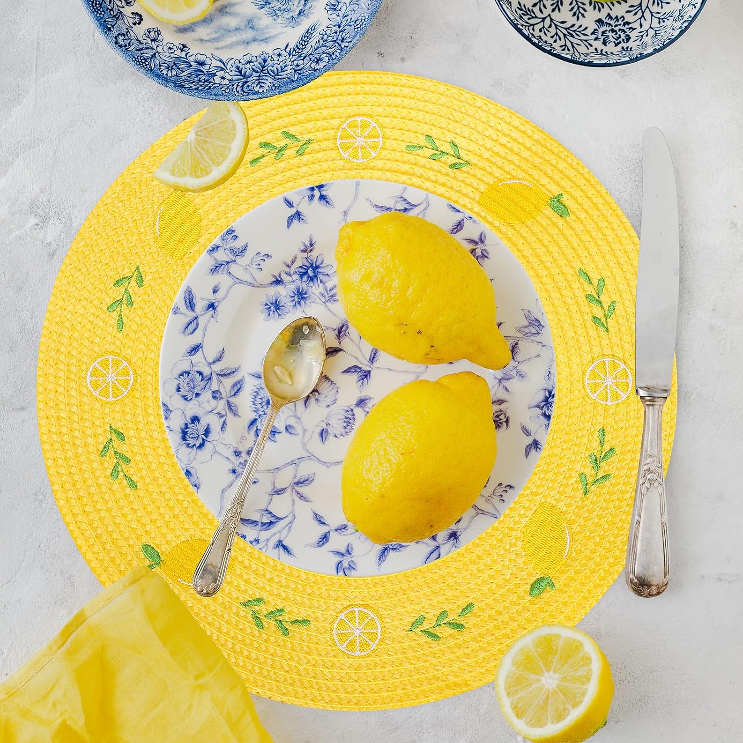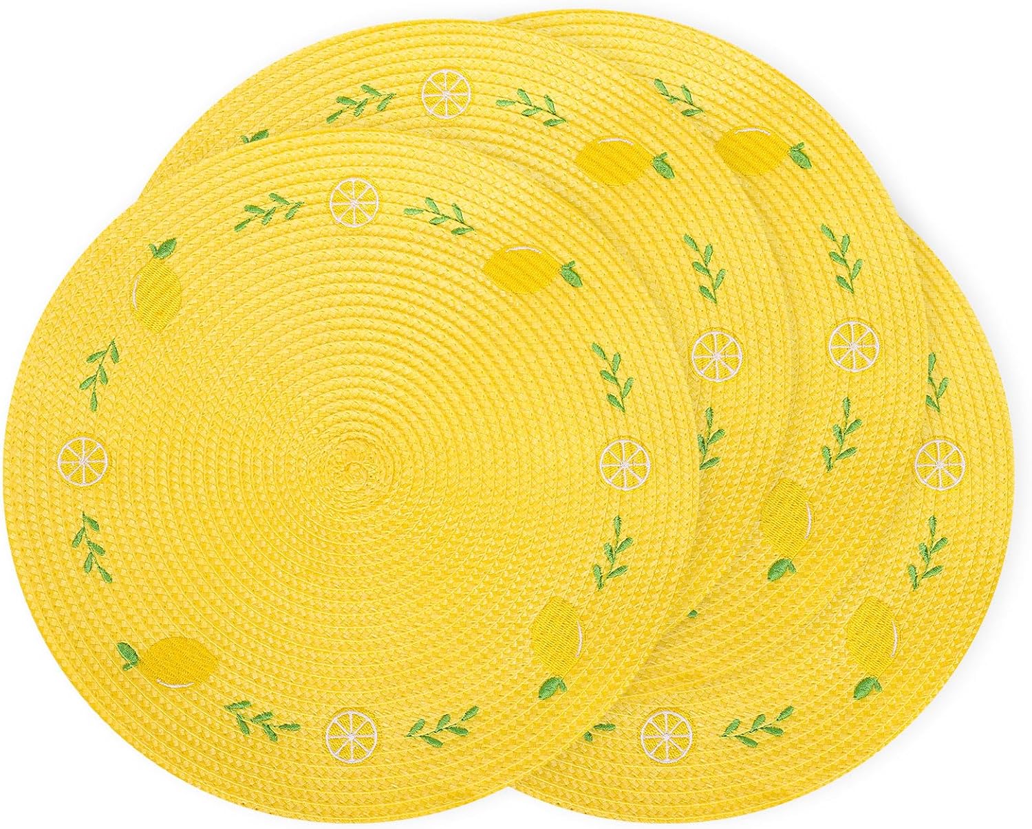 Whaline 4Pcs Round Placemats Lemon Embroidered Place Mats Summer Lemon Greenery Leaves Dinner Table Mats for Home Wedding Baby Shower Birthday Party Decor
