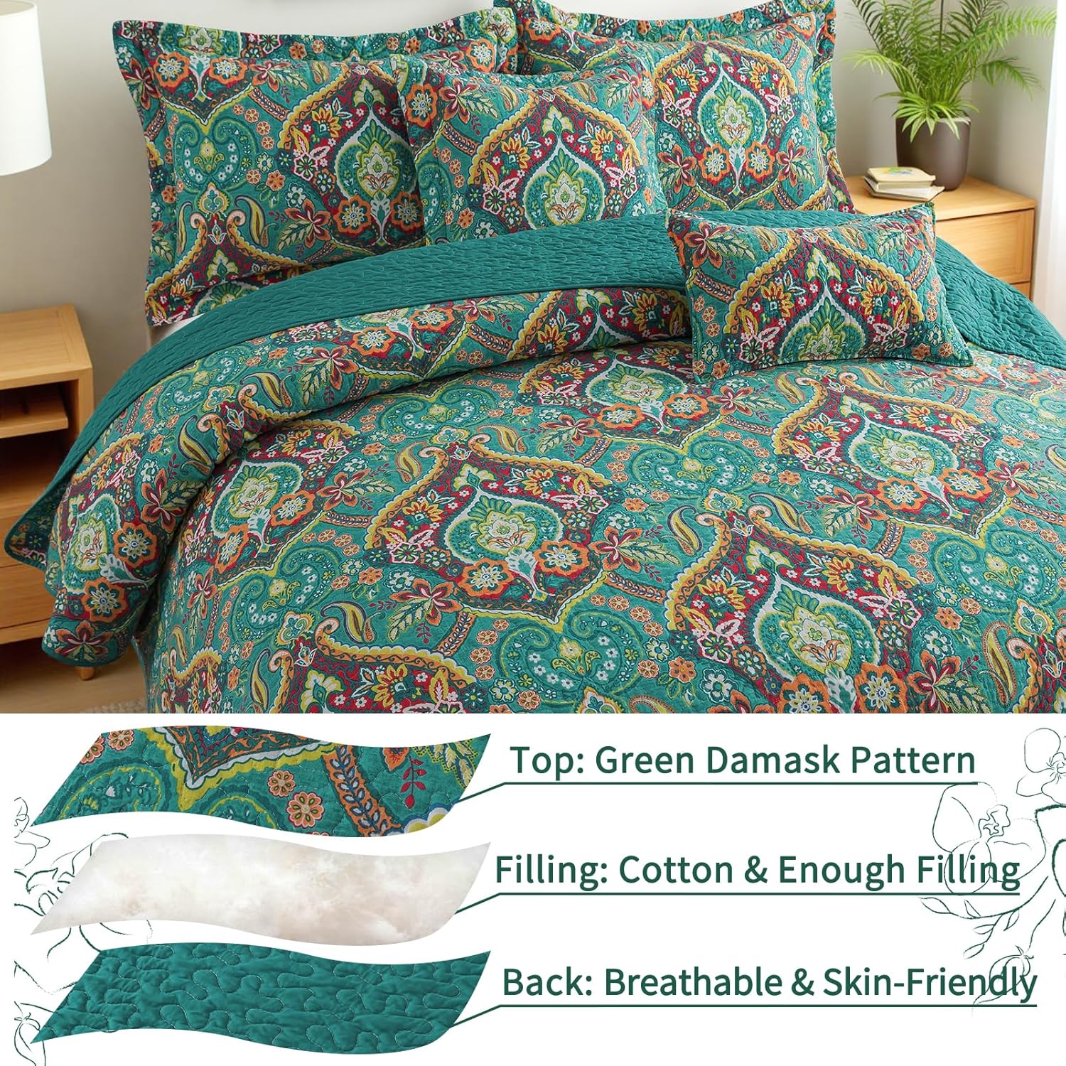 • 【3-Layer All-Season Comfort】 Cotton queen quilt set is composed of three layers, floral bedding woven cover, inner cotton filling, and solid color woven backing. Three layers of farmhouse queen size quilts for bed are stitched together with fine handwork, trapping warmth in winter and breathable in summer for year-round coziness.