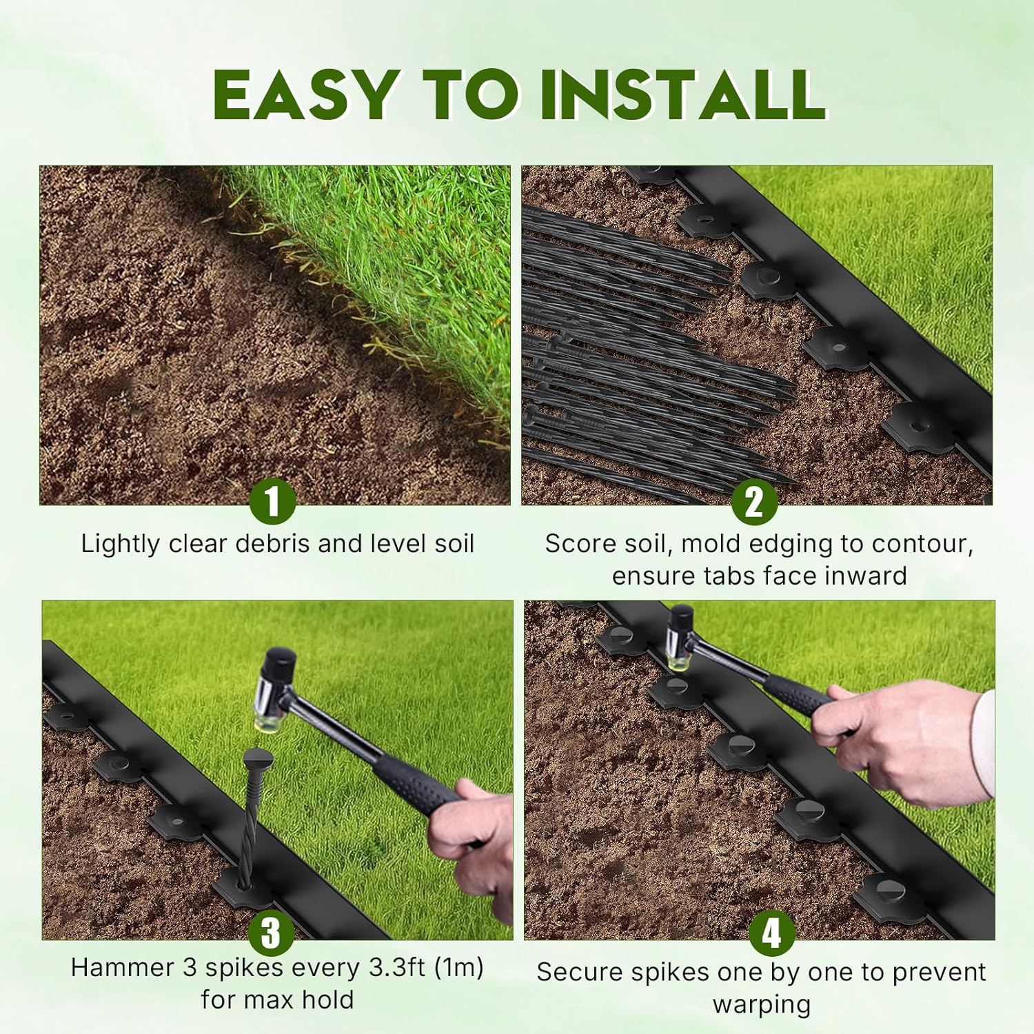 • Family Essential]Each set includes: 1 roll of landscape edging (2in * 66Ft), 200 anti detachment spiral nails (galvanized and rust proof treatment), 1 glove and 1 engineering rubber hammer (ergonomic handle). Professional tip: Lay flat in sunlight for 2 hours before installation to eliminate curling memory. It is recommended to use extended ground nails for snow construction. Sandy soil requires shortening the nail spacing to 10 inches.
