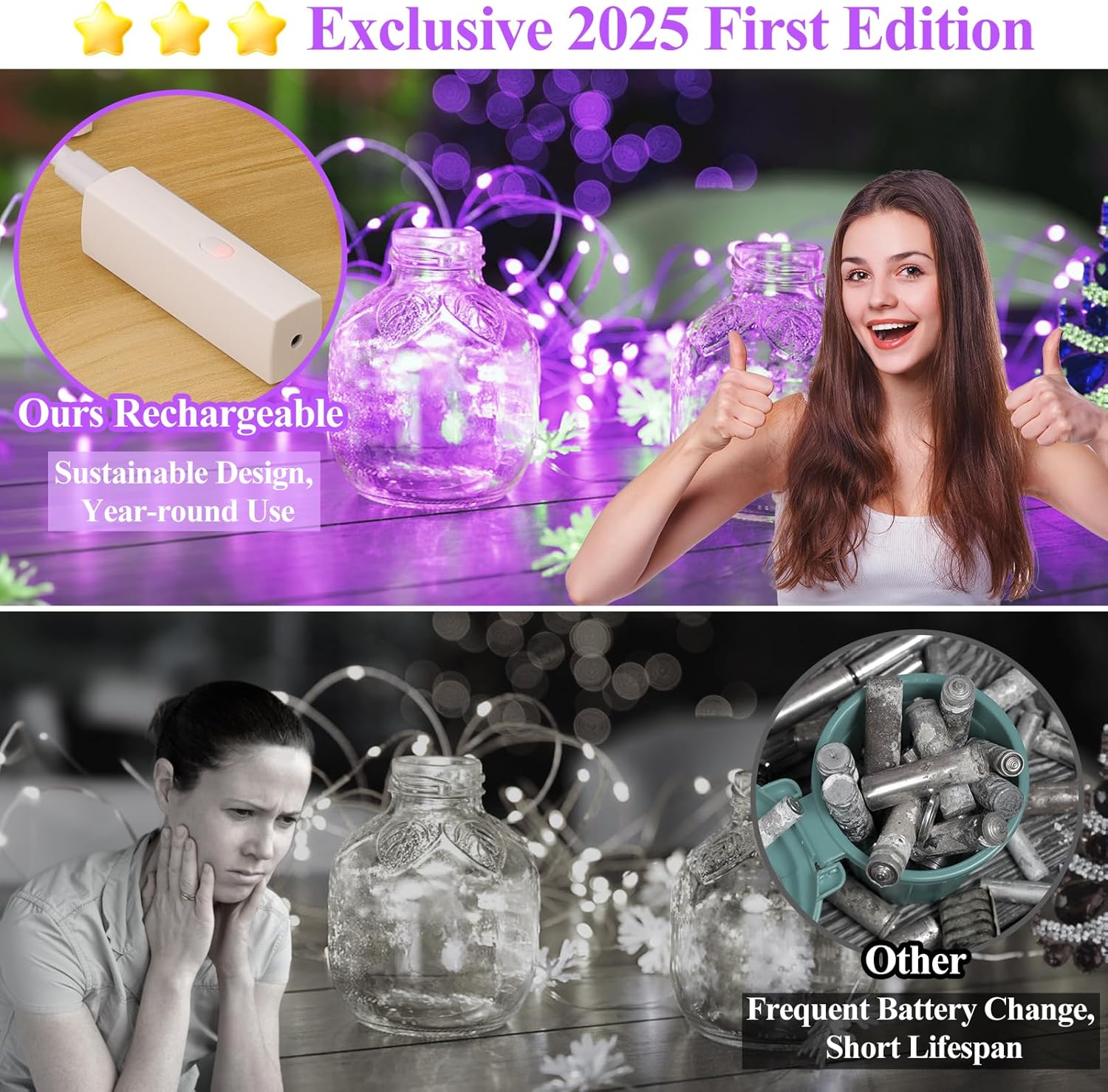 • 2025 Specially Developed Battery Operated String Lights: Say goodbye to disposable batteries and embrace sustainability! Our rechargeable Type-C power bank (cable included) powers the twinkle lights for 30+ hours of cordless glow. When it’s time to recharge, simply detach the compact, lipstick-sized power bank—no need to move the entire string lights. Designed with an innovative, patented structure, this power bank offers a smarter, greener way to shine