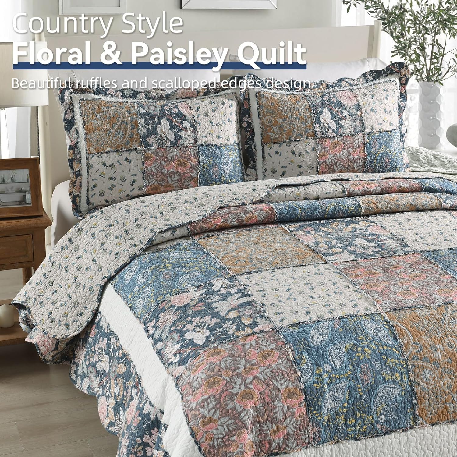 • BEAUTIFUL QUILT SET: Country style blue floral and paisley patchwork with ruffles; The real patchwork quilt set is stitched with beautiful floral and paisley patterns pieces and with delicate ruffles on it. The quilt set is reversible and lightweight. Its another side is designed with floral spots on it. Combined with unique floral and paisley elements and elegant colors, the queen bedspread will bring your room a fresh look.