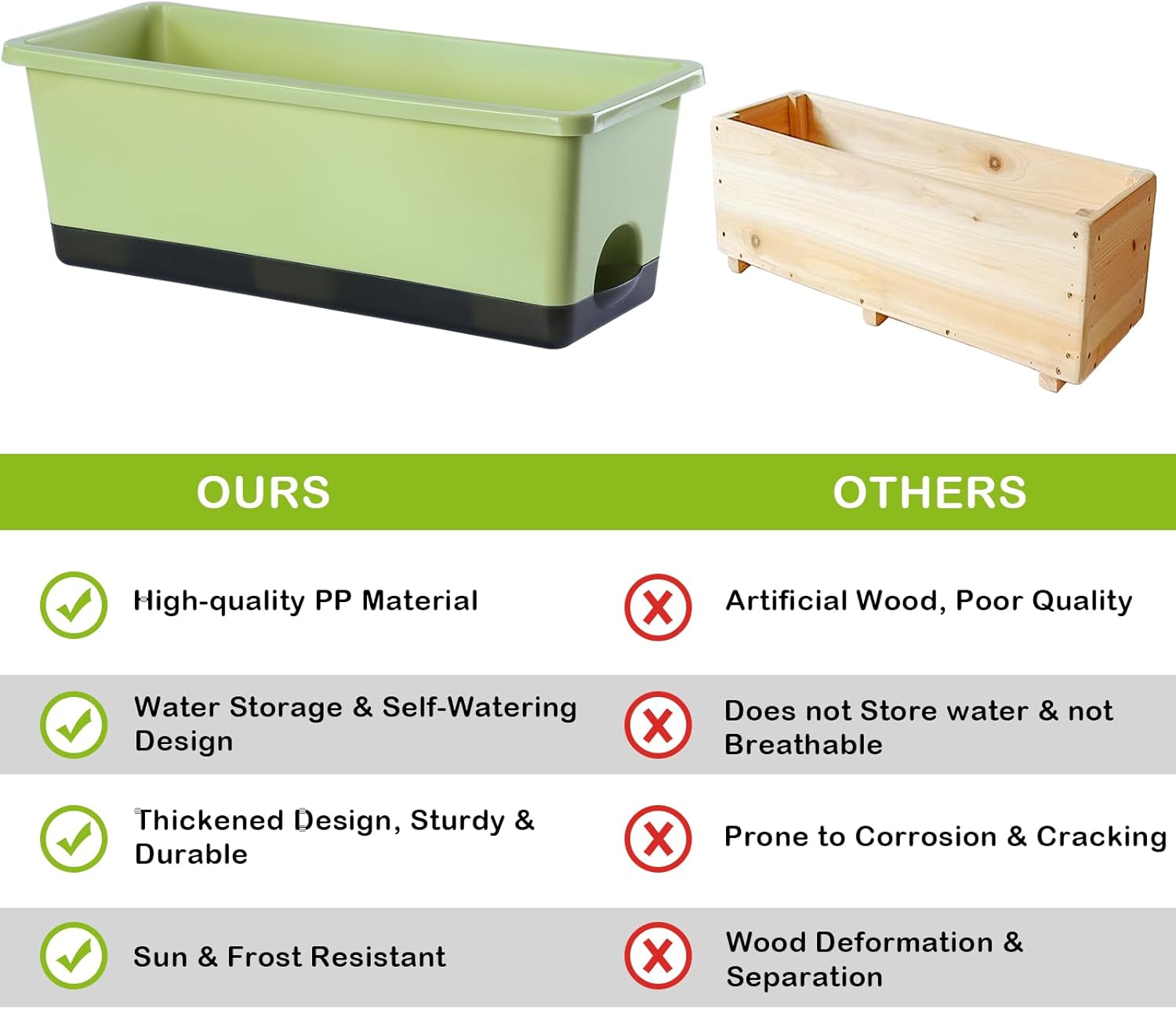 • 【Premium & Durable】The planter pots are made of high quality PP material and has been thickened to bear up to 300KG (660LB). This window box planter is sturdy, wear-resistant and durable. It can be exposed to light, wind, and sunlight for long periods of time, with a lifespan of decades. It is an excellent planter box for both indoor and outdoor.